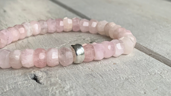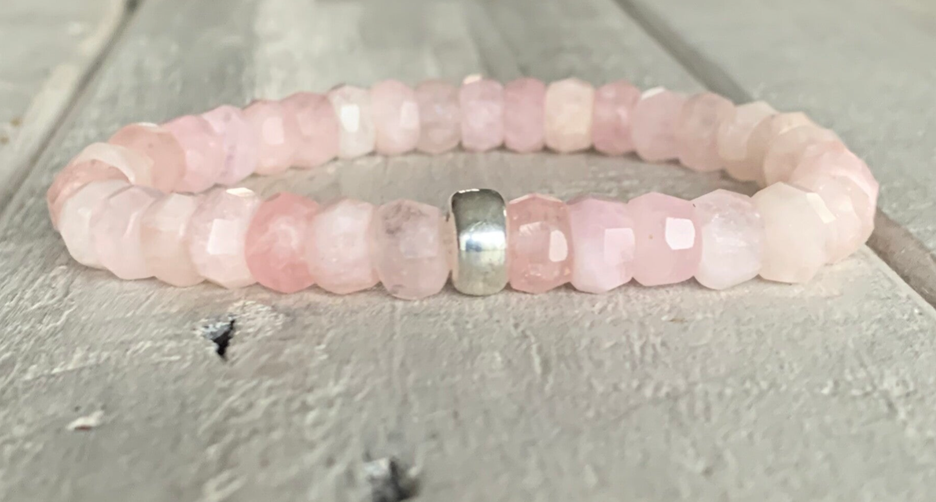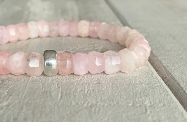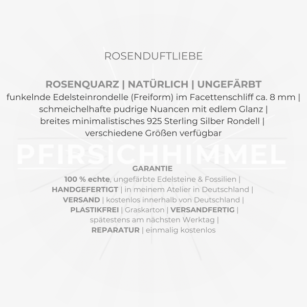 Im zauberhaft funkelnden Rosenquarz Edelstein Armband ROSENDUFTLIEBE sind ca. 8 mm große, facettierte Rondelle (Freiform), veredelt mit einem minimalistischen 925 Sterling Silber Rondell zu einem beeindruckenden Lieblingsschmuckstück verarbeitet.