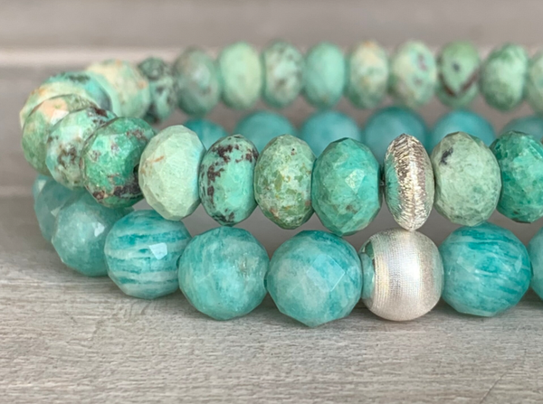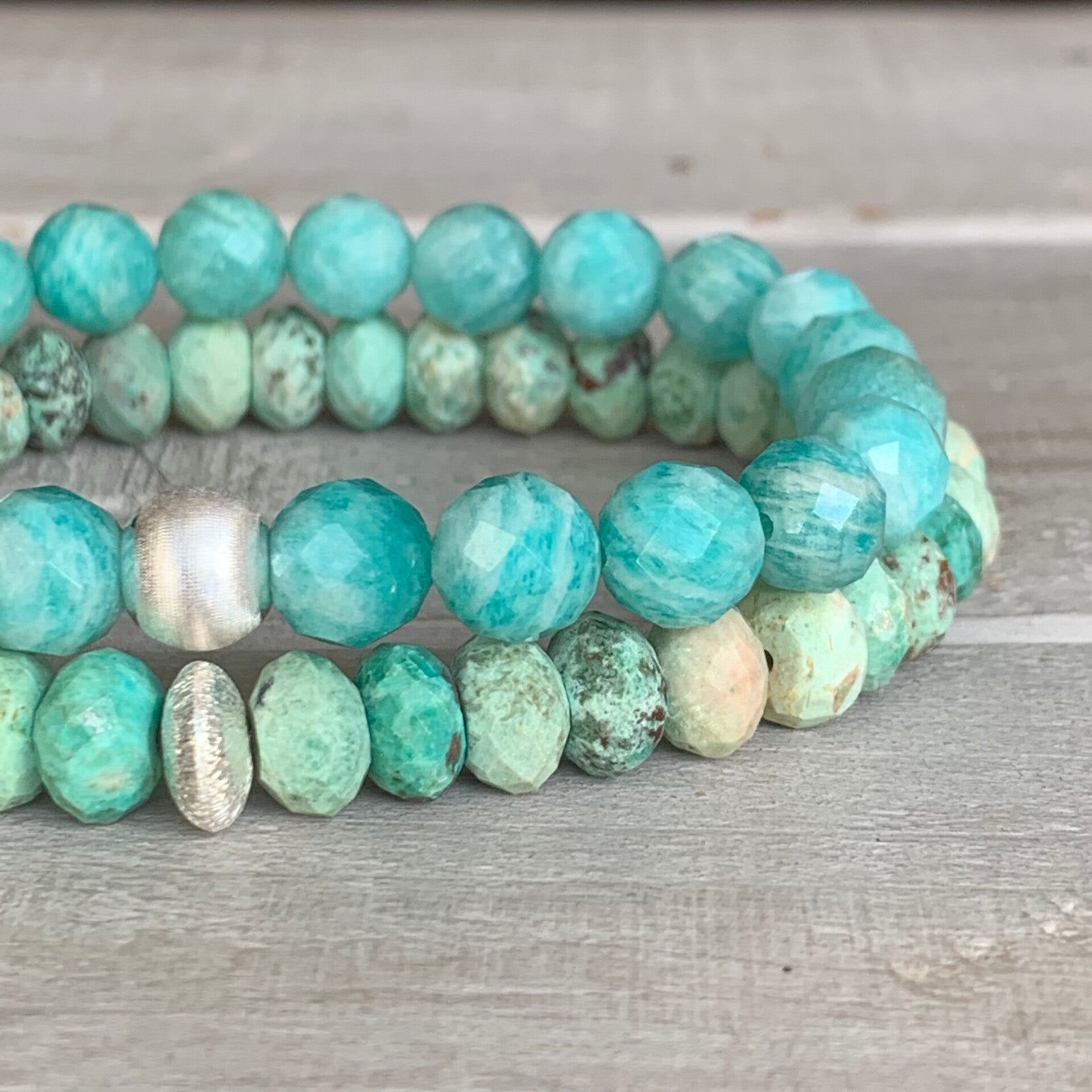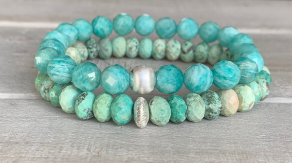 Im minimalistischen Amazonit Edelstein Armband SALZWASSER sind exklusive 8 mm Edelsteinperlen in wunderschönen türkisfarbenen Nuancen zu einem eleganten Schmuckstück verarbeitet. Die feinen Facetten glitzern und funkeln zauberhaft im Licht. Dieses bemerkenswerte Perlenarmband im edlen Bohostyle wird zusätzlich durch eine fein strukturierte 925 Sterling Silber Perle aufgewertet, die sich stilvoll zwischen die auffallend schönen Edelsteine einreiht.