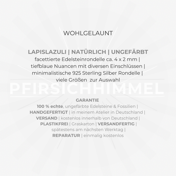 Im filigranen Lapislazuli Edelstein Armband WOHLGELAUNT sind attraktive 4 mm zarte Lapislazulirondelle, veredelt mit fünf minimalistischen 925 Sterling Silber Rondellen, zu einem feinen Lieblingsschmuckstück verarbeitet. Wie immer ist unser echter Schmuck in natura noch viel schöner!