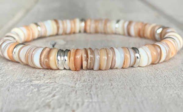 Minimalistisches Boho Surfer Armband KITE-10 im hawaiianischen Stil aus Heishi Naturmuscheln in verschiedenen Natur-/Beigenuancen. Sorgfältig handgefertigt und schlicht mit einem 925 Sterling Silber Rondell sowie versilberten Rondellen verfeinert.