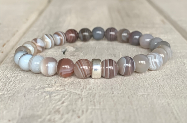Zur Auswahl stehen zwei zauberhafte 4 und 6 mm Botswana Achat Edelstein Armbänder, denen wir den schönen Namen WARMHERZIG gegeben haben! Botswana Achat ist eine atemberaubende Varietät des Achats, die für ihre sanften, erdigen Farben und charakteristischen Muster bekannt ist.