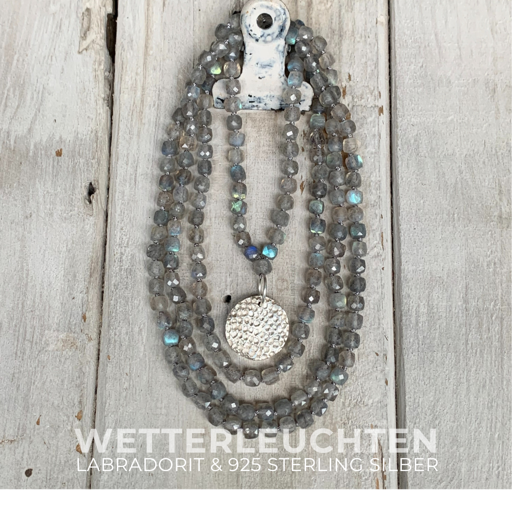 Die handgeknüpfte zarte Labradorit Halskette WETTERLEUCHTEN, aus feinen quadratischen Edelsteinperlen im funkelnden Facettenschliff, vervollständigt nicht nur deinen Look, sie trägt mit dem von Hand gefertigten 925 Sterling Silber Anhänger auch eine tiefere "versteckte" Bedeutung in sich. Dieses von Anfang bis Ende handgefertigte Schmuckstück ist mehr als nur eine Edelsteinkette, es ist ein Ausdruck deiner Persönlichkeit und deiner Werte!