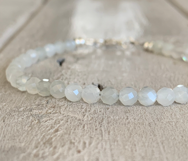 Dieses zarte Mondstein Schmuckstück haben wir bewusst ganz minimalistisch gehalten. Wir fertigen es dir passgenau an, so dass die funkelnden Edelsteinperlen im Fokus sind und nichts von den wunderschönen Mondsteinen ablenkt. Die für deinen Armumfang exakte Größe ergibt einen hohen Tragekomfort, rundherum ganz schlicht und ohne hängende Elemente.