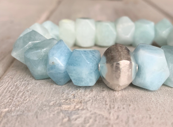 Veredelt ist dieses zauberhafte Armband mit seinen atemberaubenden Aquamarinen mit einem großen passenden 925 Sterling Silber Rondell, dass die Form der Freiform Rondelle sehr edel aufgreift.