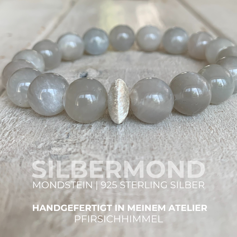 Im eleganten Mondstein Edelstein Armband SILBERMOND sind beeindruckende ca. 10 mm hellgrau Edelsteinperlen, veredelt mit einem strukturierten 925 Sterling Silber Rondell, zu einem stilvollen und zugleich zeitlosen Schmuckstück verarbeitet.