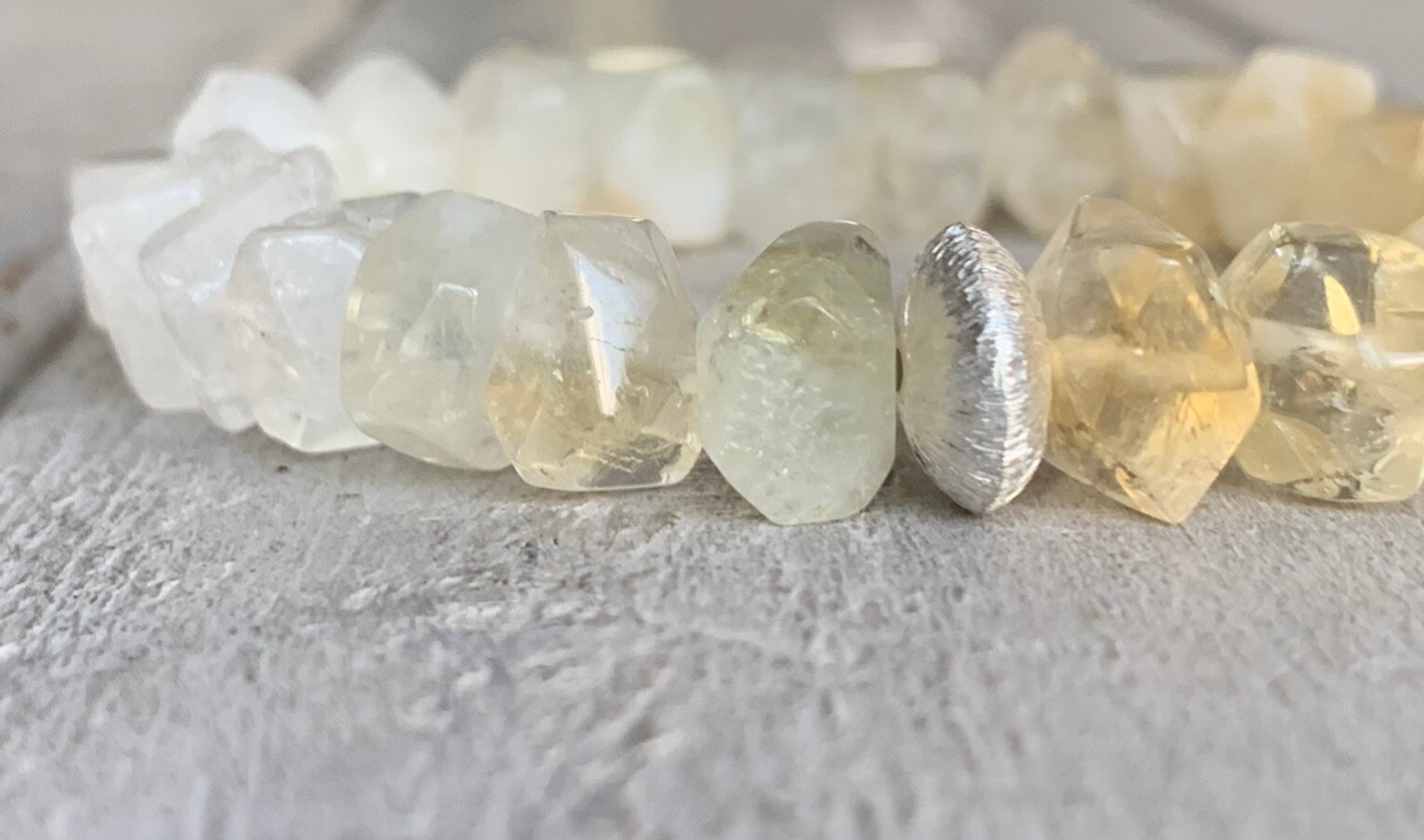 Im kraftvollen Citrin Edelstein Armband ZITRONENTEE sind beeindruckende ca. 10 bis 14 mm große, facettierte Citrin Rondelle (Freiform) zu einem elegant funkelnden Lieblingsschmuckstück im minimalistischen Bohostyle verarbeitet.