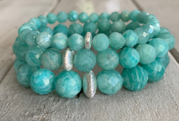 Im minimalistischen Amazonit Edelstein Armband SALZWASSER sind exklusive Edelsteinperlen in wunderschönen türkisfarbenen Nuancen zu einem eleganten Schmuckstück verarbeitet. Zur Auswahl stehen 6, 8 und 10 mm große Edelsteinperlen. Die feinen Facetten glitzern und funkeln zauberhaft im Licht. Dieses bemerkenswerte Perlenarmband im edlen Bohostyle wird zusätzlich durch ein fein strukturiertes 925 Sterling Silber Rondell aufgewertet, die sich stilvoll zwischen die auffallend schönen Edelsteine einreiht.