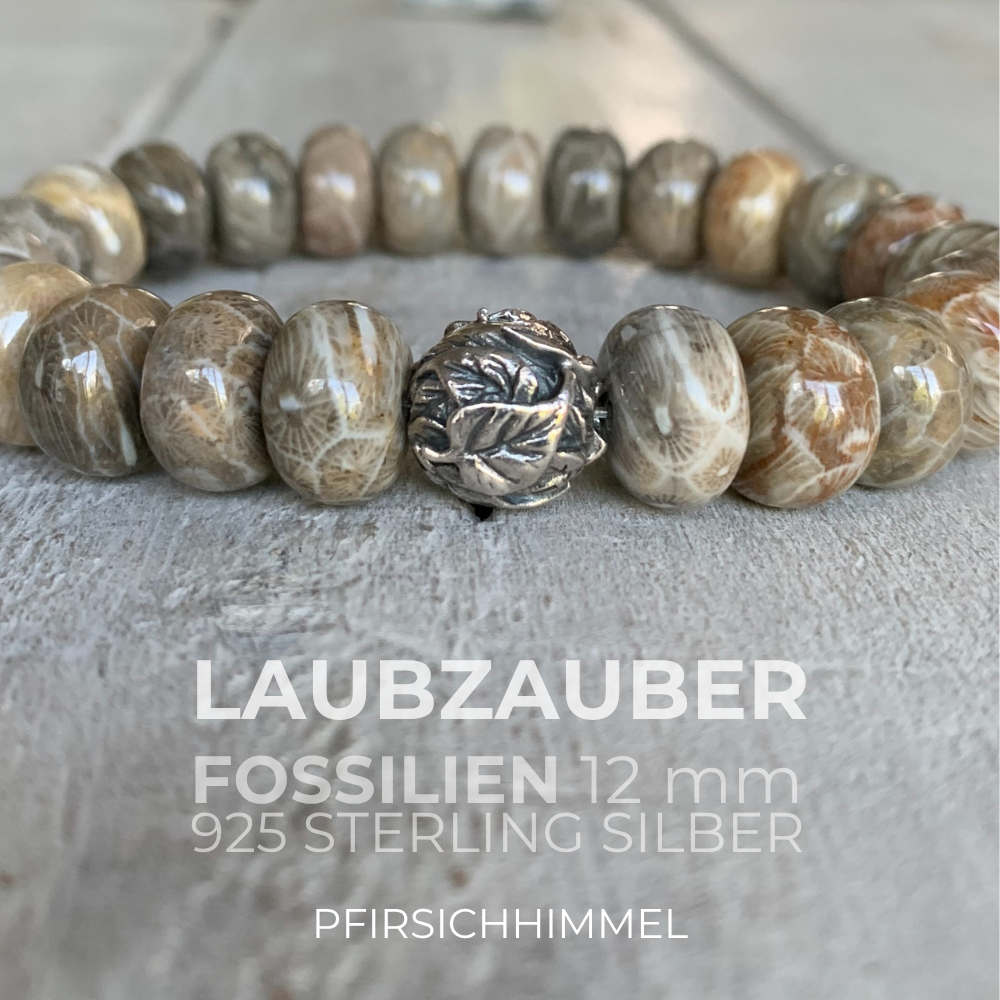 FOSSILIEN Armband Rondelle | 925 Sterling Silber Perle Blätter | ca. 12 mm | LAUBZAUBER