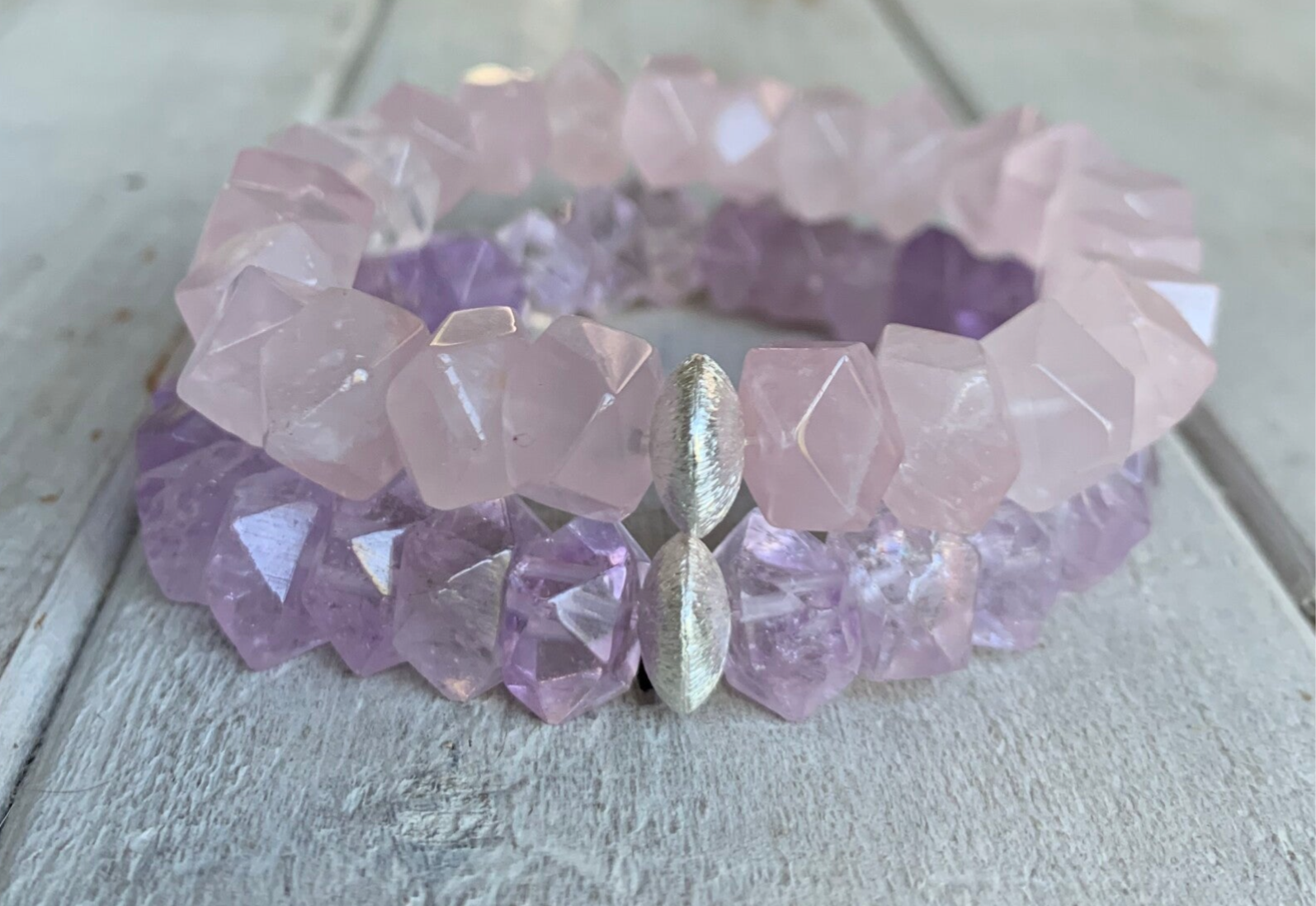 Mehrere Armbänder lassen sich perfekt im Layering-Look miteinander kombinieren und tragen. Stilsicher und harmonisch in verschiedenen Ausführungen. Echte Edelsteine faszinieren mit natürlicher Schönheit. Sterling Silber sorgt für eine cleane und moderne Note. Das Video und Foto mit zwei Edelstein Armbändern zeigt das charmante Gegenstück aus Amethyst Rondellen. Du findest dieses Armband ebenfalls im Shop!