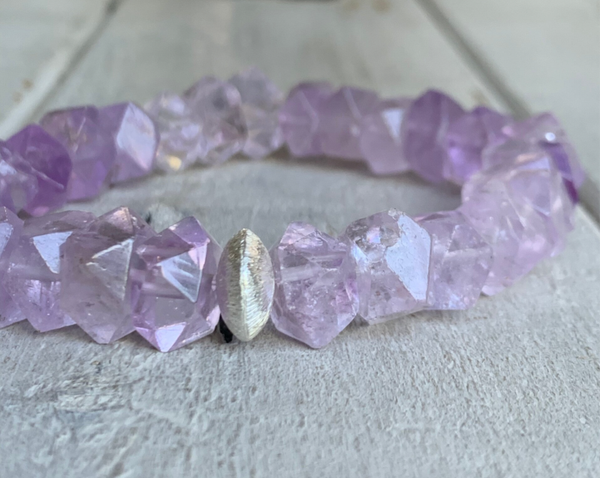 Im exklusiven Amethyst Edelstein Armband FLIEDERVIOLETT sind beeindruckende ca. 10 bis 14 mm große, facettierte Rondelle (Freiform), veredelt mit einem fein strukturierten 925 Sterling Silber Rondell, zu einem beeindruckenden Lieblingsschmuckstück verarbeitet.
