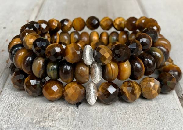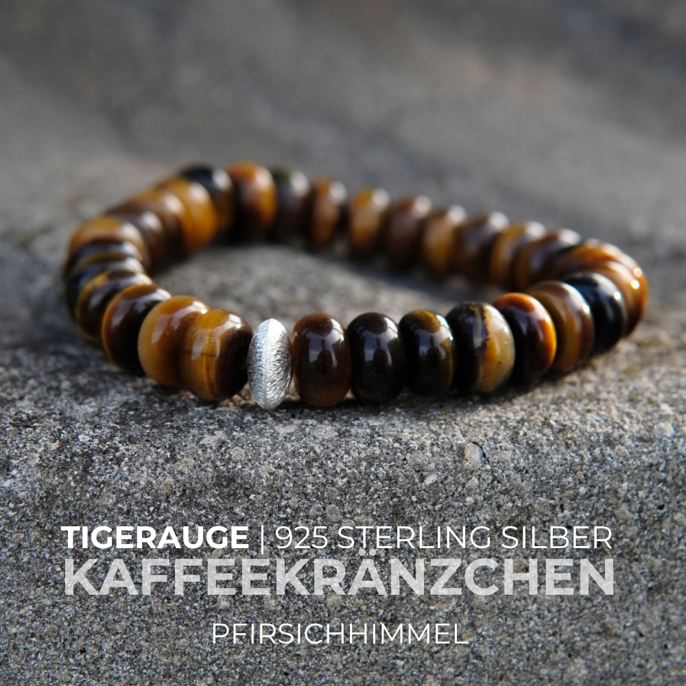 Im kraftvollen Tigerauge Edelstein Armband KAFFEEKRÄNZCHEN sind beeindruckende ca. 6 oder 10 mm große Rondelle, veredelt mit einem fein strukturierten 925 Sterling Silber Rondell, zu einem eleganten Lieblingsschmuckstück verarbeitet.