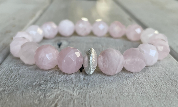 Rosenquarze können sich farblich sehr unterscheiden, denn die Farbe wird durch mikroskopische Einschlüsse anderer Mineralien verursacht. Daher gibt es farblich intensive oder auch transparente Edelsteine. In diesem schönen Armband findest du die Verarbeitung von sehr hellen bis edel durchscheinenden Rosenquarzen.
