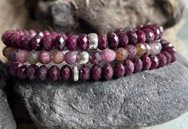 Das schmeichelhafte Rubin Edelstein Armband PURPURLIEBE - aus ca. 4,5 - 5 mm runden Rubinperlen - beeindruckt mit absolut herausragenden Lichtreflexionen und glitzert und funkelt zauberhaft im Licht. Dieses feine Perlenarmband im edlen Bohostyle wird durch eine 925 Sterling Silber Perle aufgewertet, die sich stilvoll zwischen die feinen Edelsteine einreihen. Es handelt sich um das kleinere Rubin Armband mit runden Edelsteinperlen in verschiedenen Nuancen. Auf den Fotos ist es umgeben von den einfarbigen Rubin Edelstein Armbändern ROSENSTRAUCH aus 6 mm Rondellen.