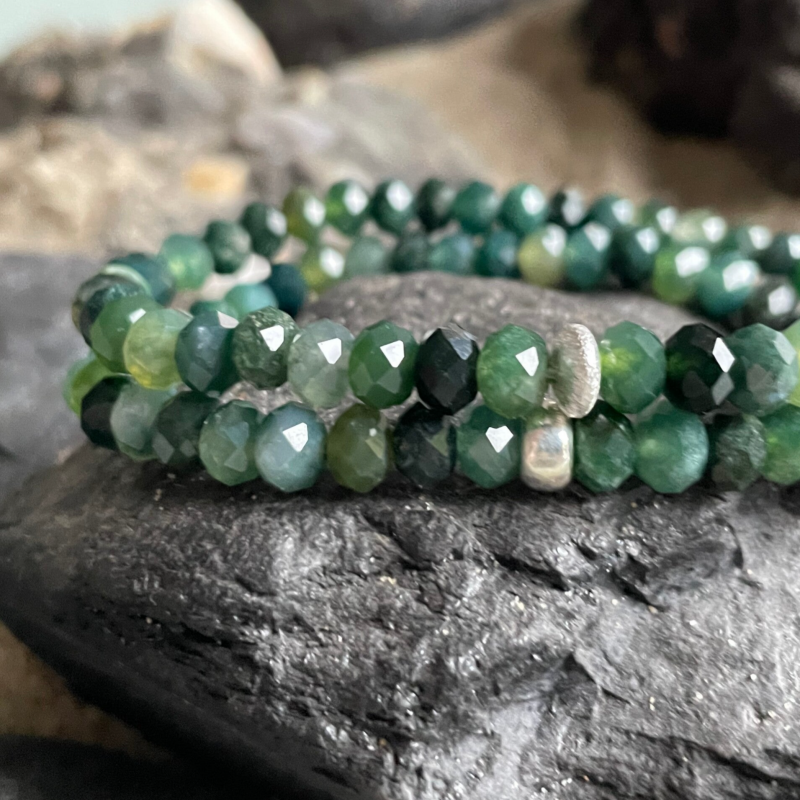 Die satten, tiefgrünen Nuancen des Moosachats zeigen sich in unzähligen Schattierungen von kräftigem Tannengrün bis hin zu moosigen, fast geheimnisvollen Farbspielen. In einigen Rondellen sind die moosähnlichen Strukturen gut erkennbar, andere überzeugen schlicht durch ihre satte Farbigkeit. Im funkelnden Facettenschliff entfalten die Edelsteine auf den dunklen Nuancen ihren natürlichen Glanz und erinnern an Sonnenstrahlen, die durch ein Blätterdach fallen.