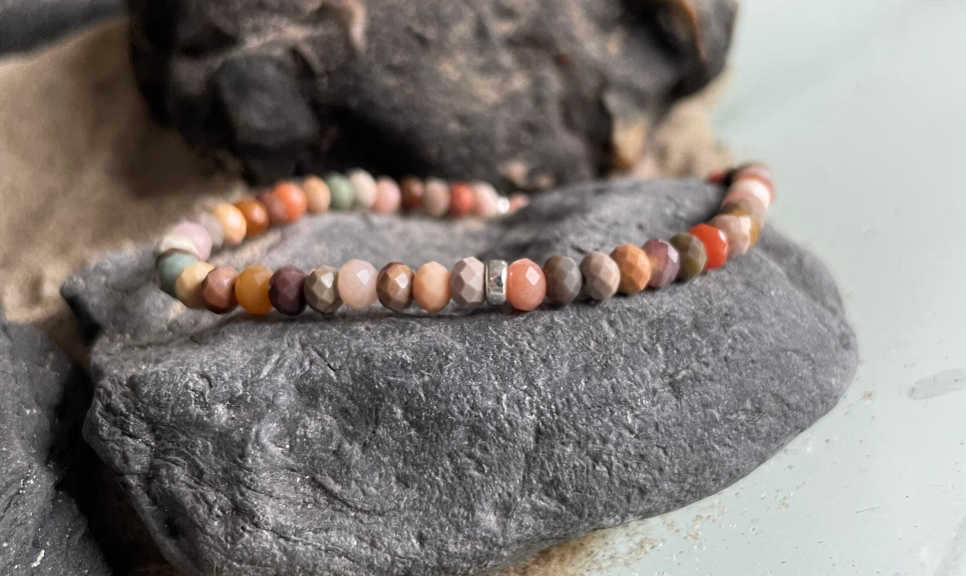 Ein Hauch von Leichtigkeit, eingefangen in funkelnden Facetten: Die zarten Achat Edelstein Armbänder SCHÖNDENKER vereinen ca. 4-5 mm und 6 mm Rondelle in pastelligen Naturtönen – mit sanften Rosé-Nuancen, cremefarbenen Schimmern und warmen Erdtönen.