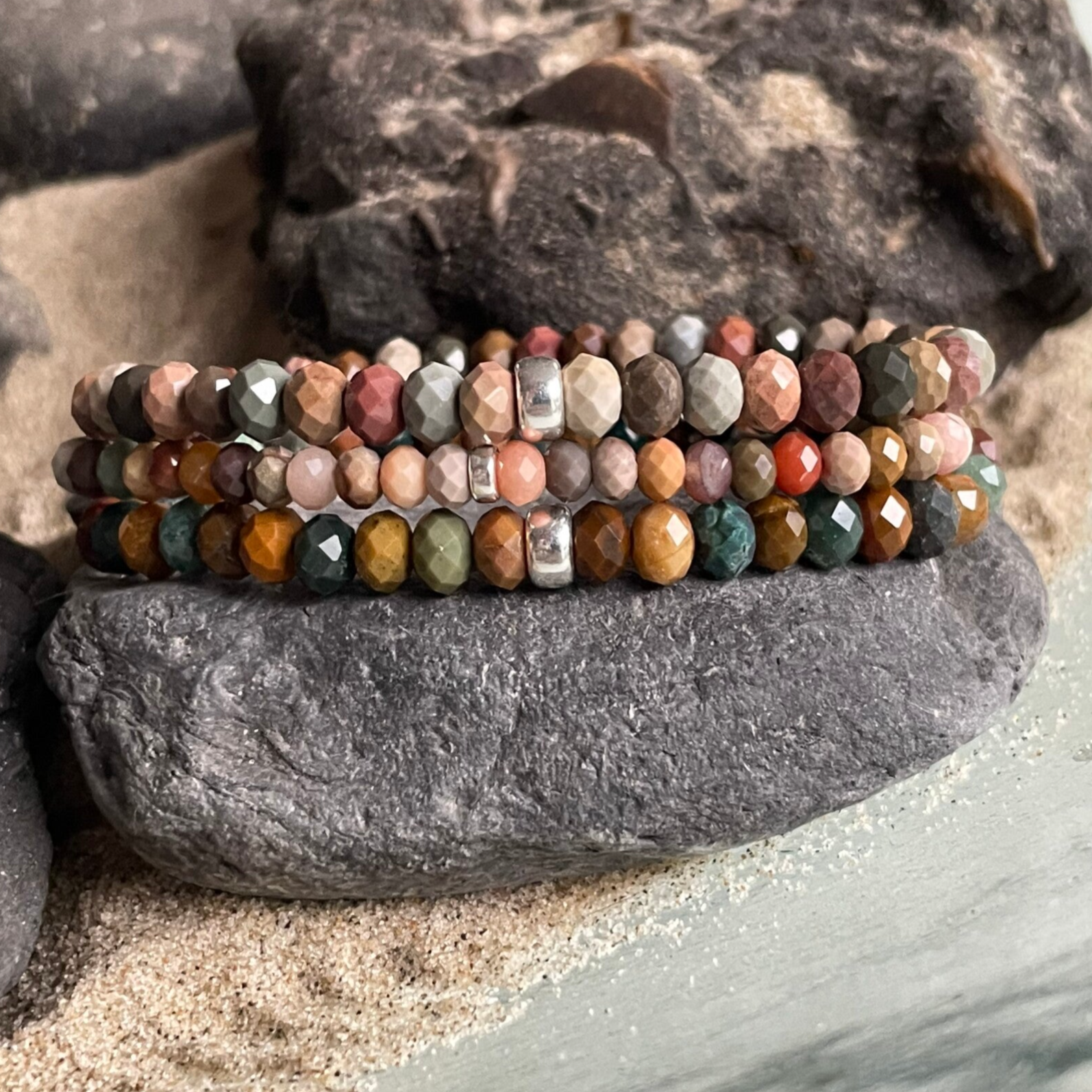 Ein Hauch von Erdverbundenheit, eingefangen im Glanz feiner Facetten. Das Achat Edelstein Armband MISCHWALD vereint ca. 6 mm facettierte Rondelle in satten, blickdichten Naturtönen mit kräftigen Khaki- und Olivnuancen, leuchtenden Blau- und Petrolnuancen und warmen Brauntönen.