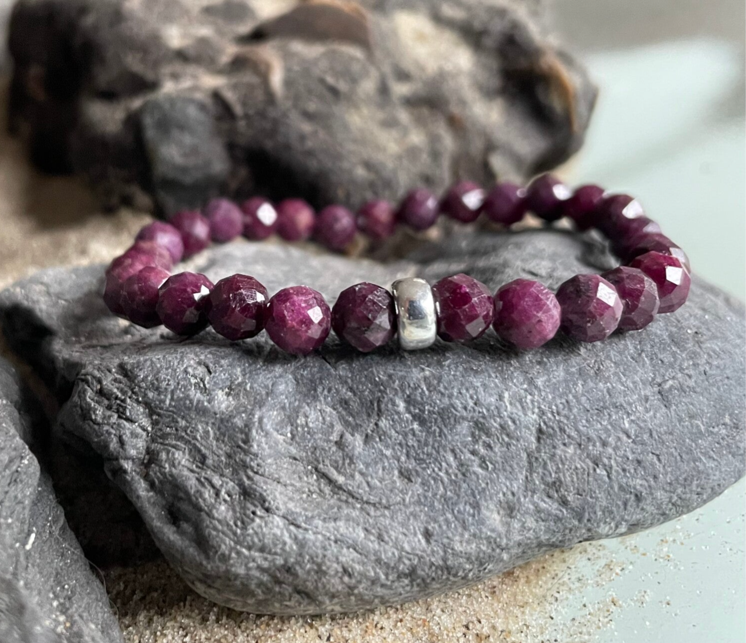 NATURWALD – ein Edelstein Armband wie ein Spaziergang durch einen spätsommerlichen Rosengarten. Die facettierten 6 mm Rubinperlen funkeln in tiefen, samtigen Rotnuancen – mal geheimnisvoll dunkel, mal mit einem zarten Hauch von Beerenrot. Jeder einzelne Edelstein trägt diesen natürlichen Glanz in sich, der an samtige Blütenblätter erinnert.