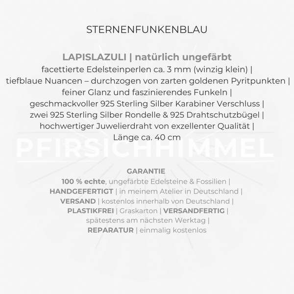 In der feinen Lapislazuli Choker Halskette STERNENFUNKENBLAU reihen sich winzige, etwa 3 mm große, facettierte Lapislazuli-Perlen zu einem himmlisch schönen Schmuckstück aneinander. Ihre tiefblauen Nuancen – durchzogen von zarten goldenen Pyritpunkten – erinnern an einen klaren Nachthimmel voller funkelnder Sterne.