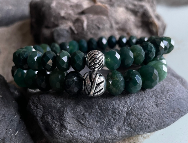Im eindrucksvollen - ca. 8 mm großen - Edelsteinarmband WANDERLUST vereinen sich feine Moosachat Rondelle - im funkelnden Facettenschliff - mit einem 925 Sterling Silber-Element zu einem stilvollen Lieblingsschmuckstück im edlen Bohostyle.