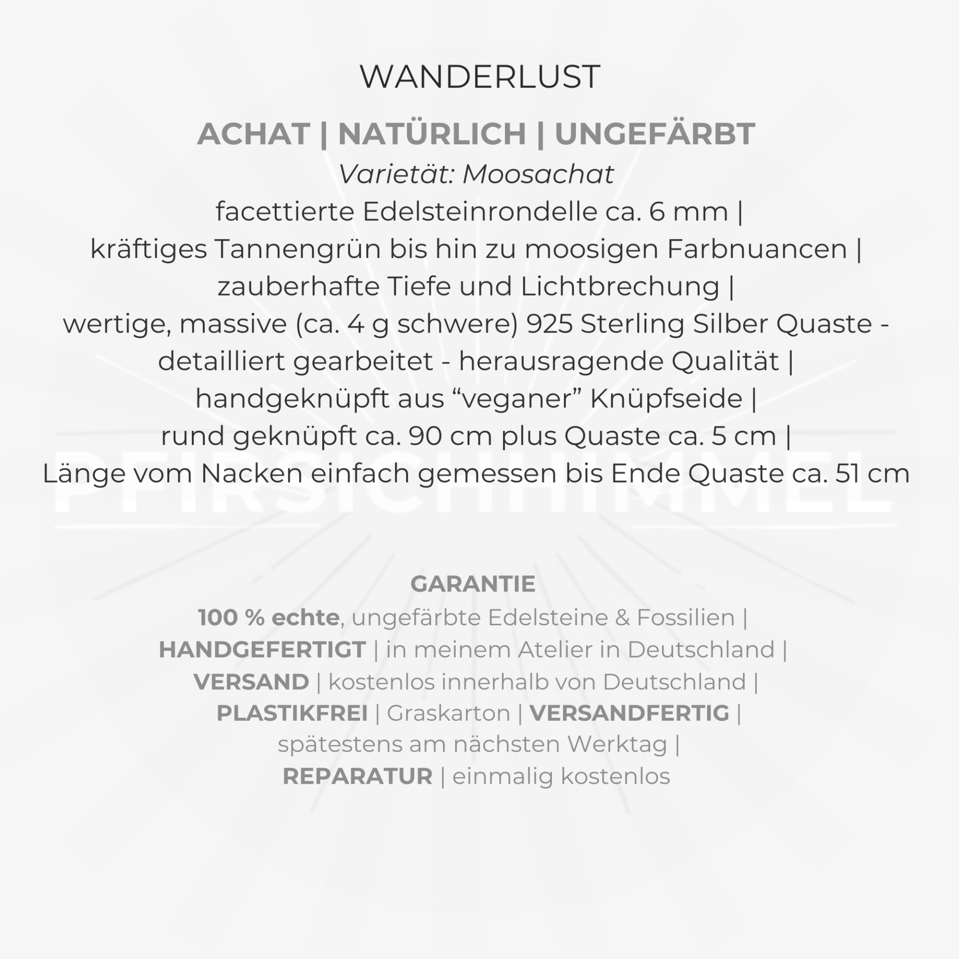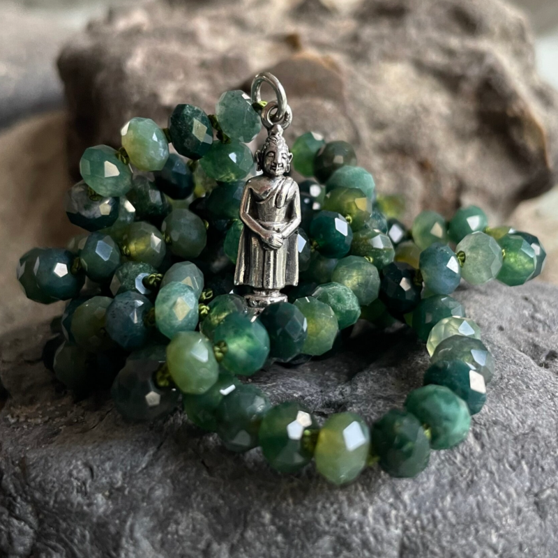 Im Alltag oder zu besonderen Momenten – die handgeknüpfte, lange WANDERLUST Mala Kette wird schnell zu deinem neuen Lieblingsschmuckstück. Veredelt wird die lange Moosachat Edelstein Kette durch eine 925 Sterling Silber Quaste von höchster Qualität.