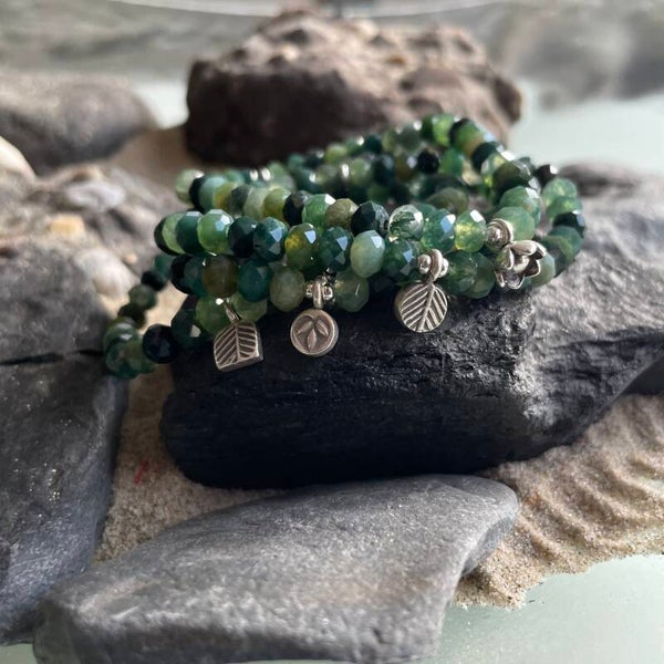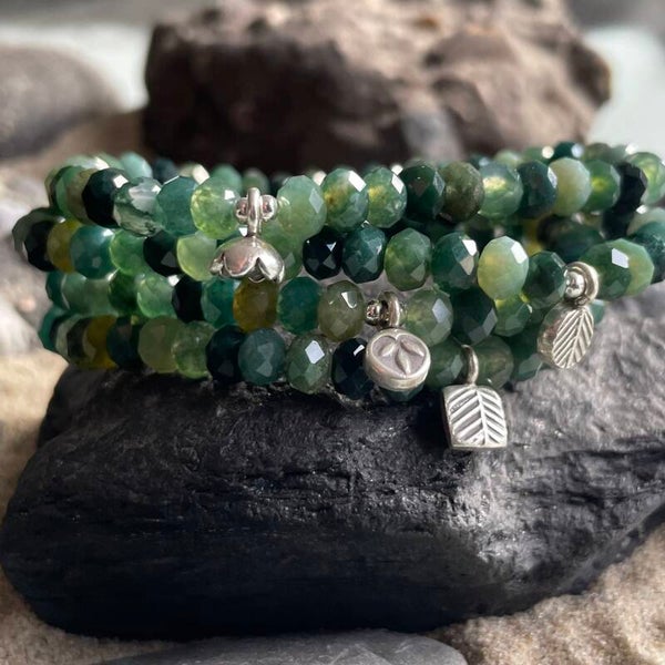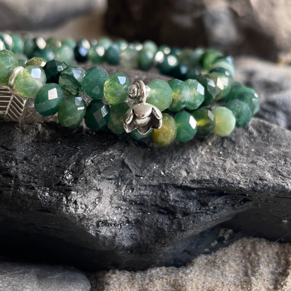 Die satten, tiefgrünen Nuancen des Moosachats zeigen sich in unzähligen Schattierungen von kräftigem Tannengrün bis hin zu moosigen, fast geheimnisvollen Farbspielen. In einigen Rondellen sind die moosähnlichen Strukturen gut erkennbar, andere überzeugen schlicht durch ihre satte Farbigkeit. Im funkelnden Facettenschliff entfalten die Edelsteine auf den dunklen Nuancen ihren natürlichen Glanz und erinnern an Sonnenstrahlen, die durch ein Blätterdach fallen.