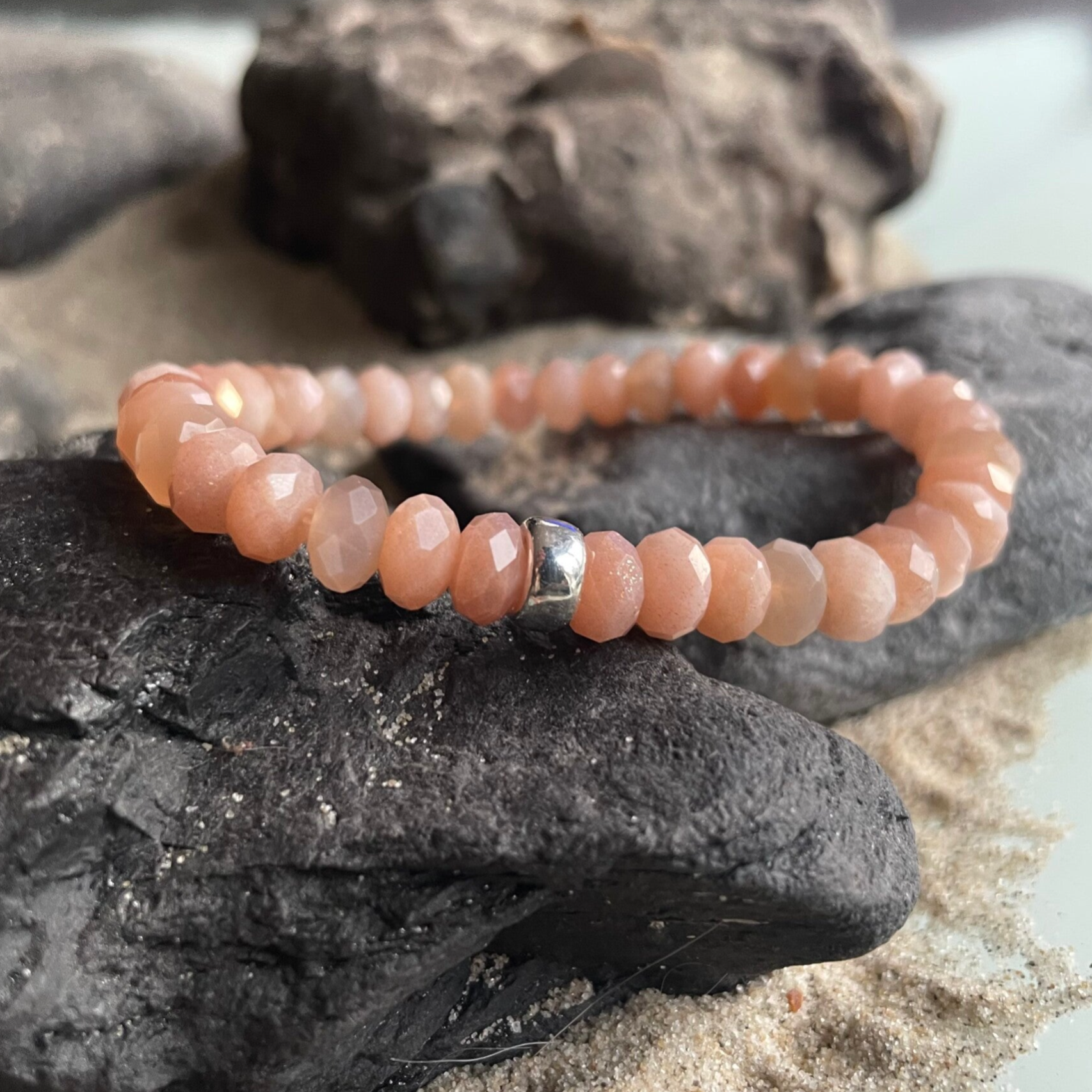 Die etwa 7,5–8 mm großen, funkelnden Rondelle zeigen die ganze Schönheit des Sonnensteins mit einem eleganten, subtilen Leuchten, das nicht aufdringlich, sondern raffiniert und schmeichelnd wirkt. Das harmonische Farbspiel und der dezente Schimmer erzeugen ein besonders weiches, feminines Gesamtbild – ein Armband, das sowohl im Alltag als auch zu besonderen Momenten strahlend zur Geltung kommt.