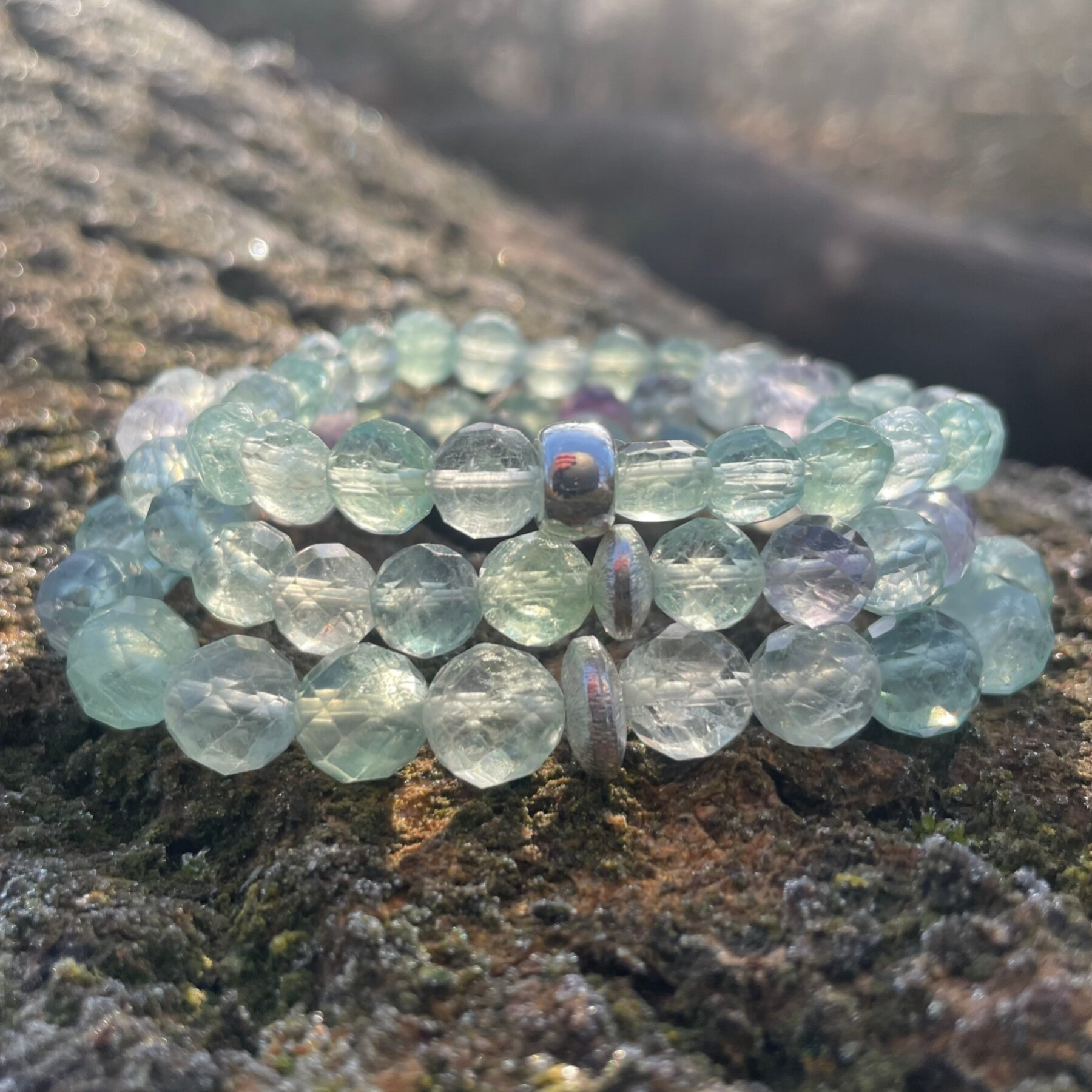 Der Fluorit in diesem Armband leuchtet in wunderschönen Nuancen, die durch Spuren oder Einschlüsse von anderen Materialien entstehen. Der Glanz von Fluorit ist glasartig, bzw. wie der Mineraloge Karl Emil Kluge (1830 bis 1864) im Jahr 1860 schreibt: "ein eigentümlicher feuchter Glasglanz", bei durchsichtiger bis durchscheinender Transparenz.