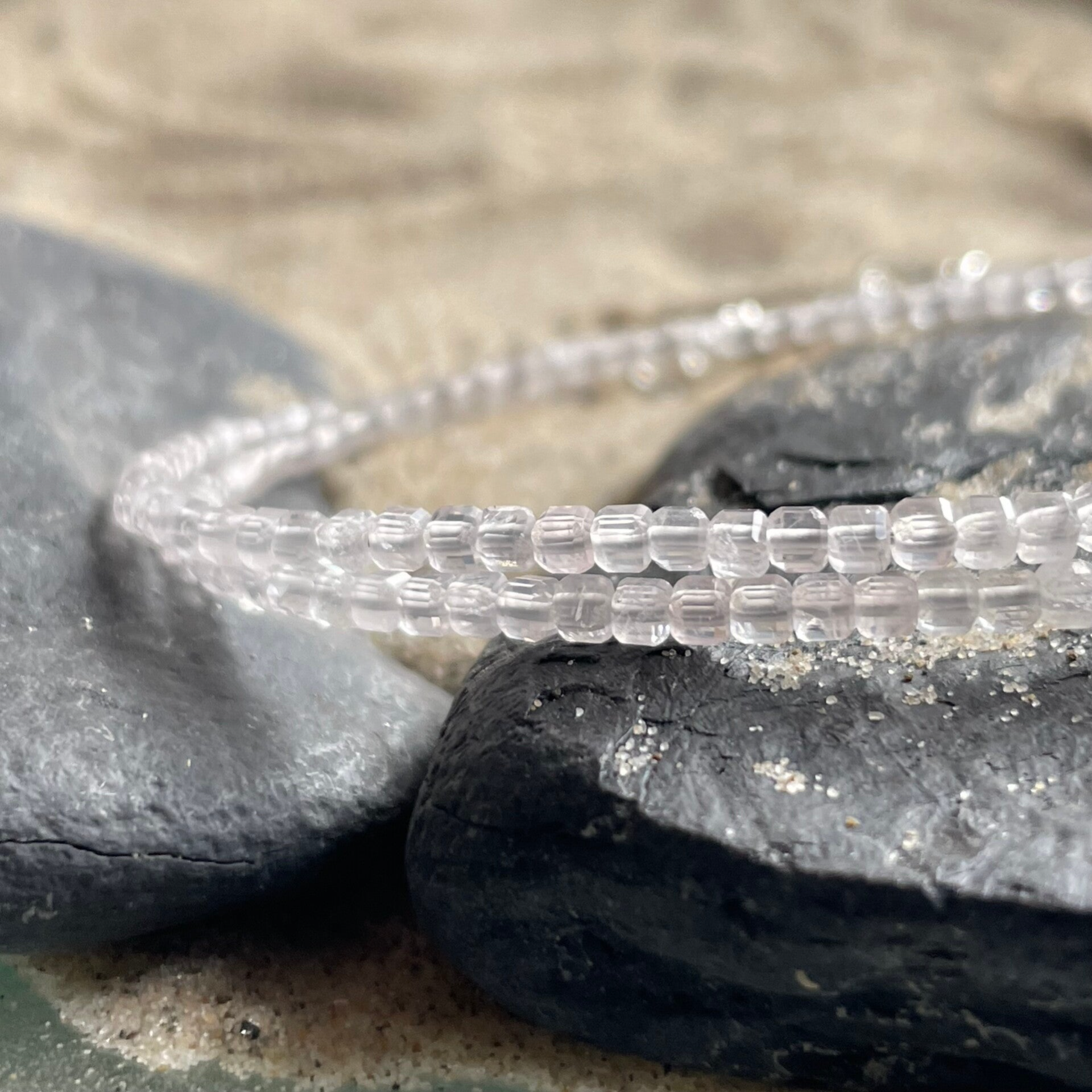 ROSENANHAUCH besteht aus ca. 2,5 mm zarten, quadratischen Rosenquarzperlen im funkelnden Facettenschliff. Die Nuancen zeigen sich in ganz hellen, pastelligen Schattierungen von nahezu transparentem Blassrosa bis zu einem feinen Puderrosa. Die Farbigkeit wirkt lichtdurchlässig, weich und beinahe schwebend.