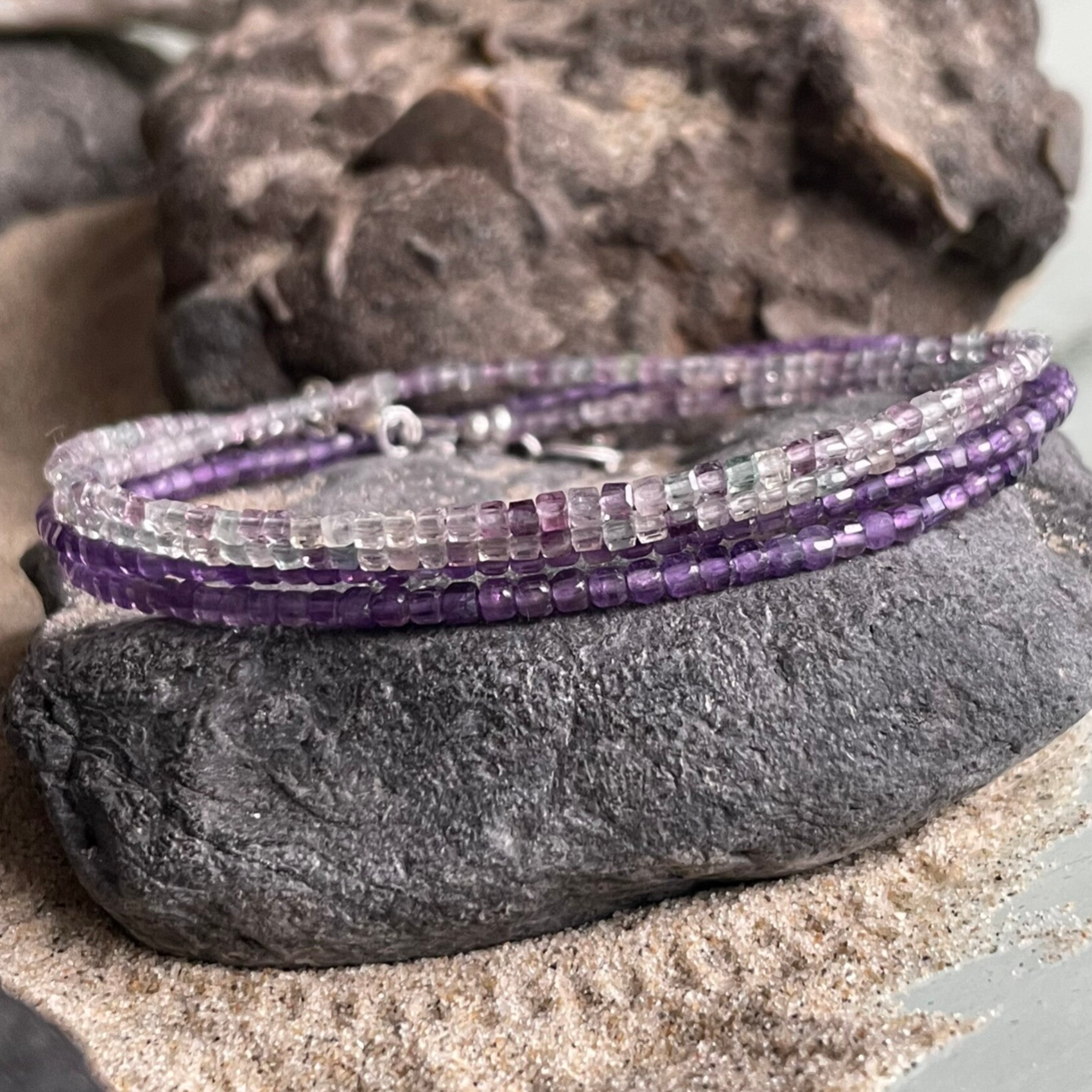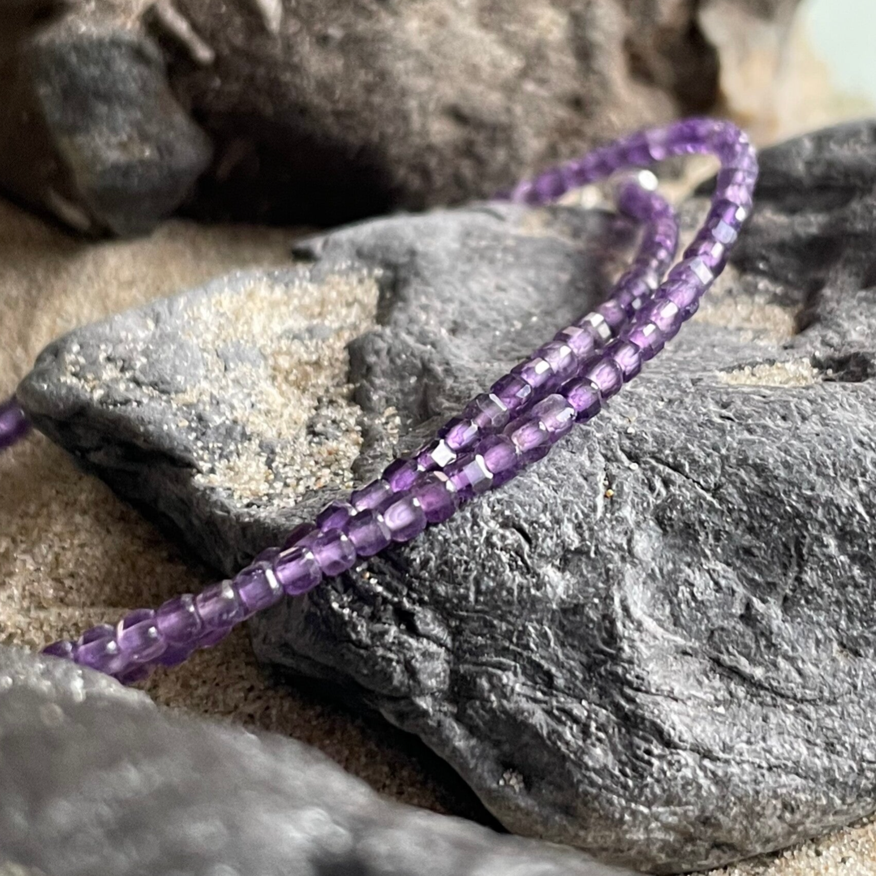 FINGERSPITZENGEFÜHL besteht aus nur 2 mm feinen, quadratischen Amethystperlen im funkelnden Facettenschliff. Die lilafarbenen Nuancen zeigen sich in tiefen, samtigen Violetttönen. Besonders auf den dunkleren Nuancen leuchten die Facetten ganz zauberhaft und verleihen dem Choker eine feine, edle Strahlkraft.
