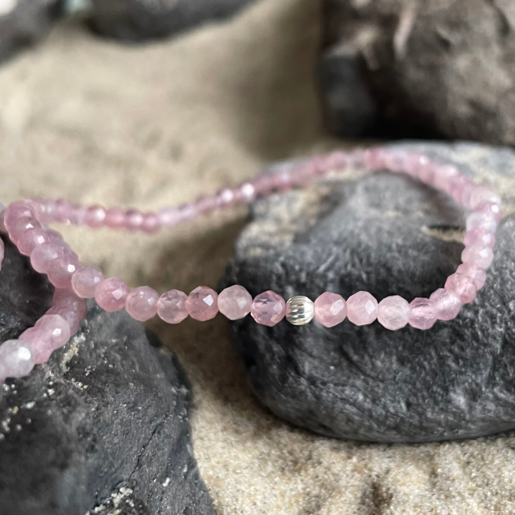 Das LIEBESZAUBER Edelstein Armband besteht aus 3 mm feinen Rosenquarzperlen im funkelnden Facettenschliff. Die Nuancen reichen von warmem Rosé über sanftes Altrosa bis hin zu zartem Blush. Unterschiedliche Schattierungen und Transparenzen verleihen dem Armband ein schmeichelhaftes, lebendiges Gesamtbild – weich im Ausdruck und dennoch präsent.