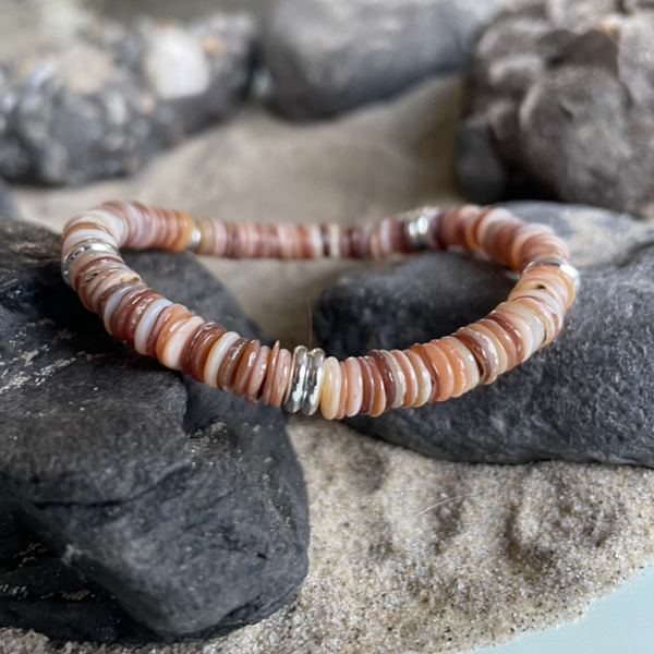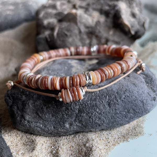 KITE-10-BRAUN ist ein filigranes Muschel Armband im Stil eines feinen Surferarmbands mit einer lässigen, natürlichen Optik. Die 5–6 mm großen Muschel Heishi Perlen zeigen warme Braun-, Karamell- und Sandnuancen, die an sonnengewärmte Strände und salzige Meeresluft erinnern. Diese Heishi Muscheln sind besonders filigran und fein für ein sehr schmeichelhaftes Gesamtbild!
