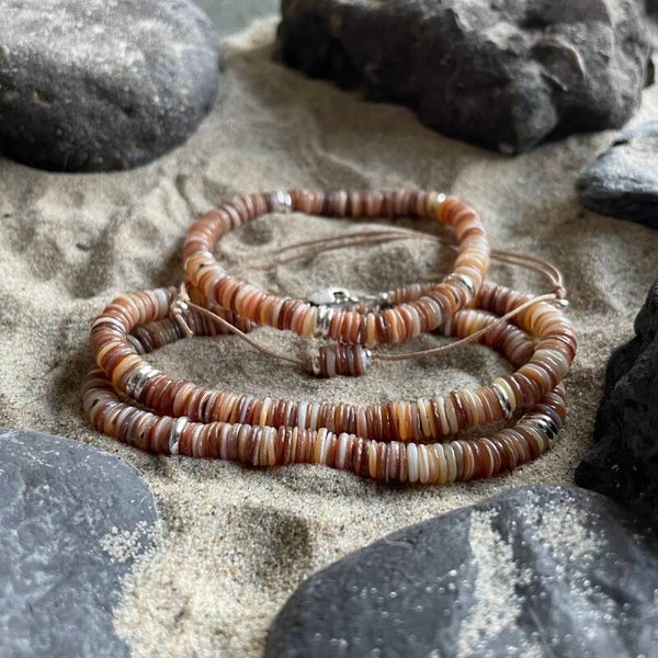 KITE-10-BRAUN übersetzt das Gefühl eines Surfertages in eine feine, stilvolle Halskette. Die 5–6 mm großen Muschel Heishi Perlen zeigen warme Braun-, Karamell- und Sandnuancen.