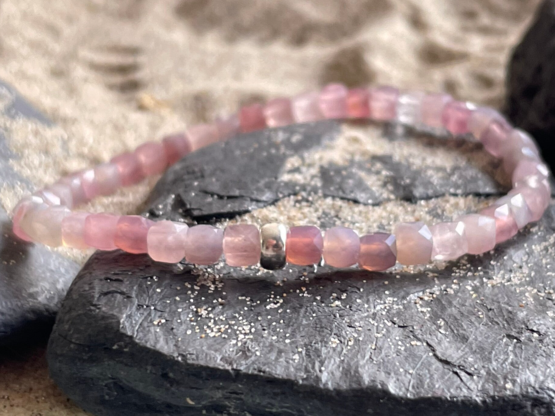 PFINGSTFERIEN ist ein zartes Rosenquarz Edelstein Armband mit einer ganz besonderen Ausstrahlung. Die ca. 4 mm kleinen, quadratischen Edelsteinperlen sind im feinen Facettenschliff gearbeitet und bringen die sanfte Farbvielfalt des Rosenquarz besonders schön zum Leuchten.