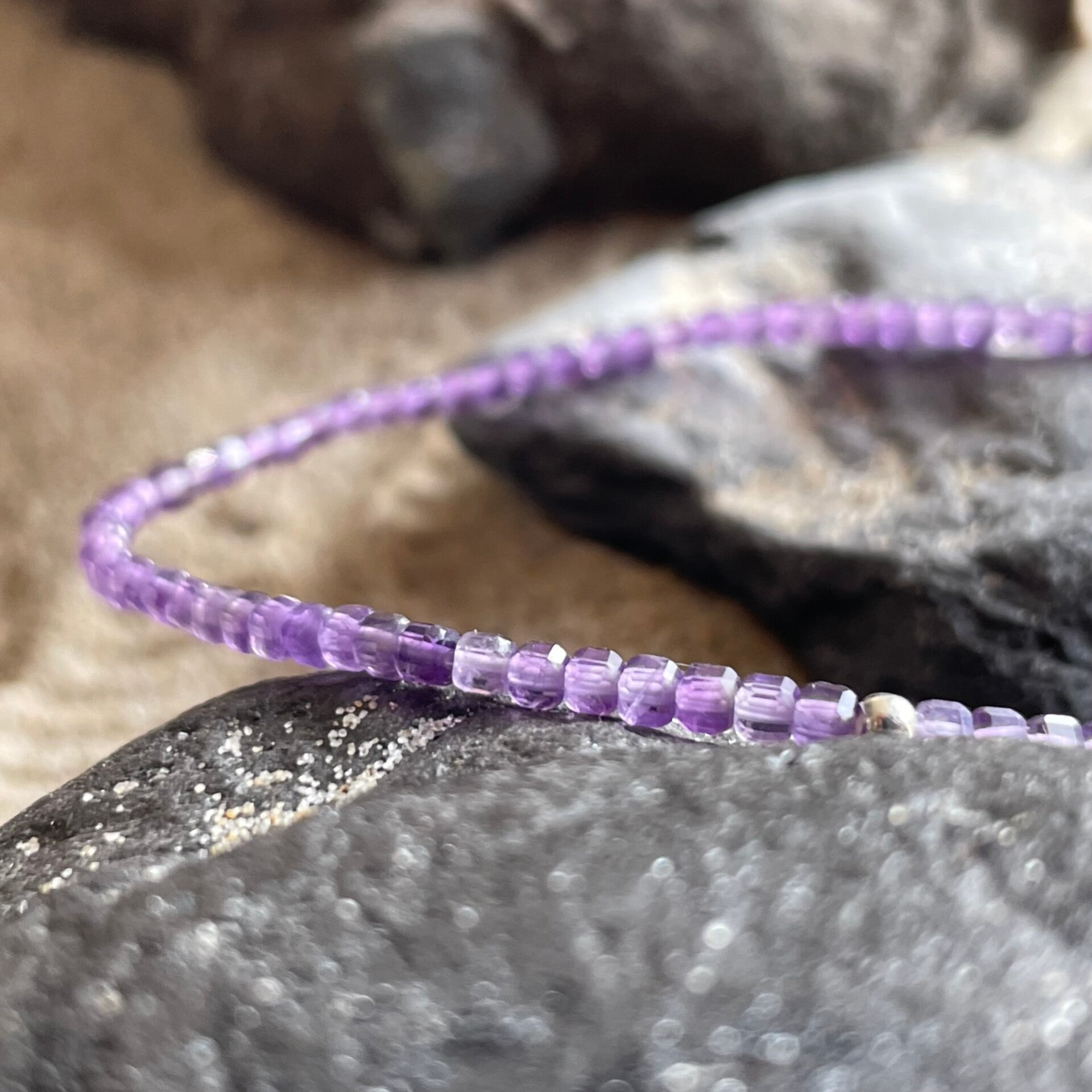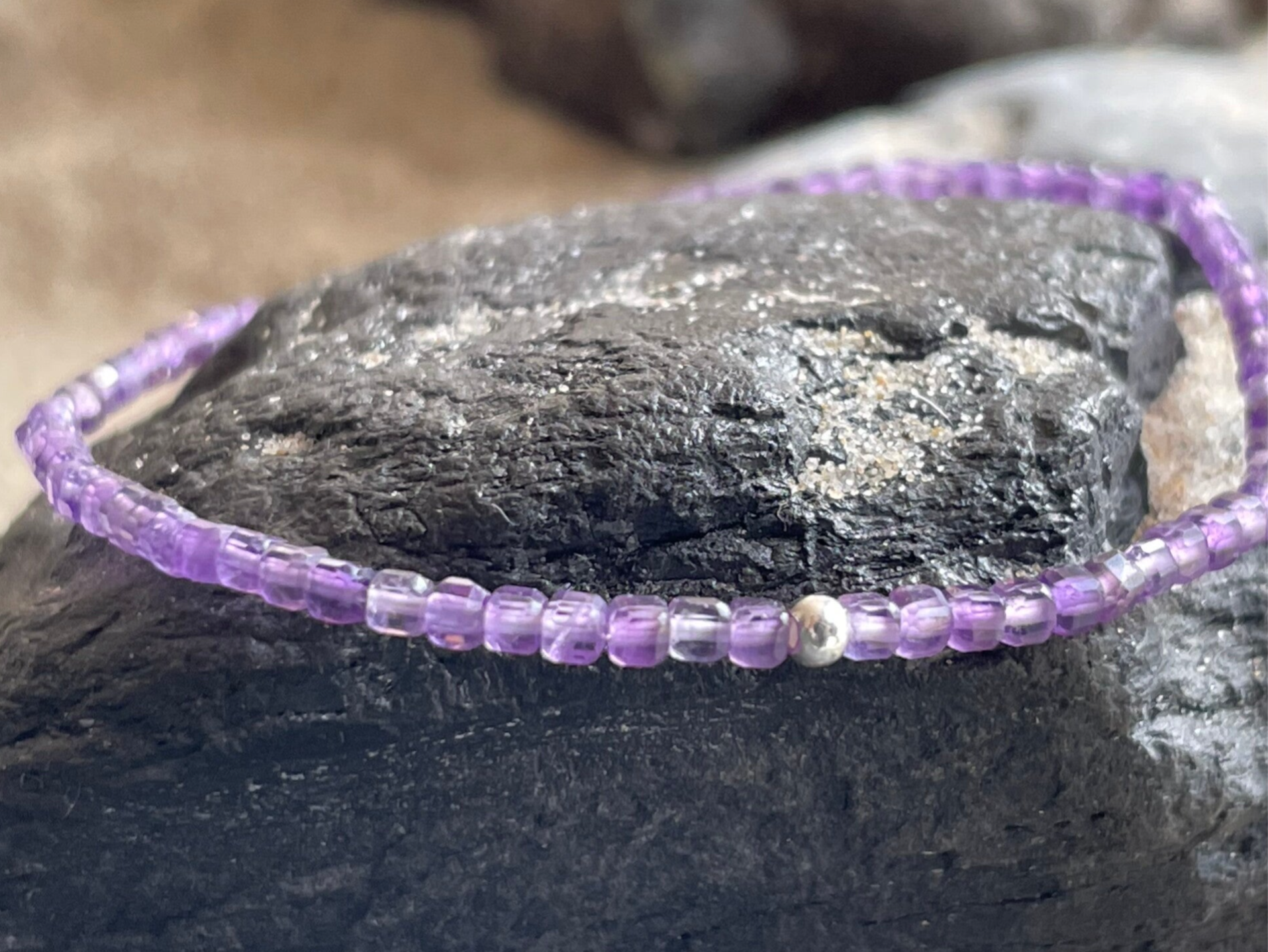 FINGERSPITZENGEFÜHL besteht aus nur 2 mm feinen, quadratischen Amethystperlen im funkelnden Facettenschliff. Die lilafarbenen Nuancen zeigen sich in tiefen, samtigen Violetttönen. Besonders auf den dunkleren Nuancen leuchten die Facetten ganz zauberhaft und verleihen dem Armband eine feine, edle Strahlkraft.