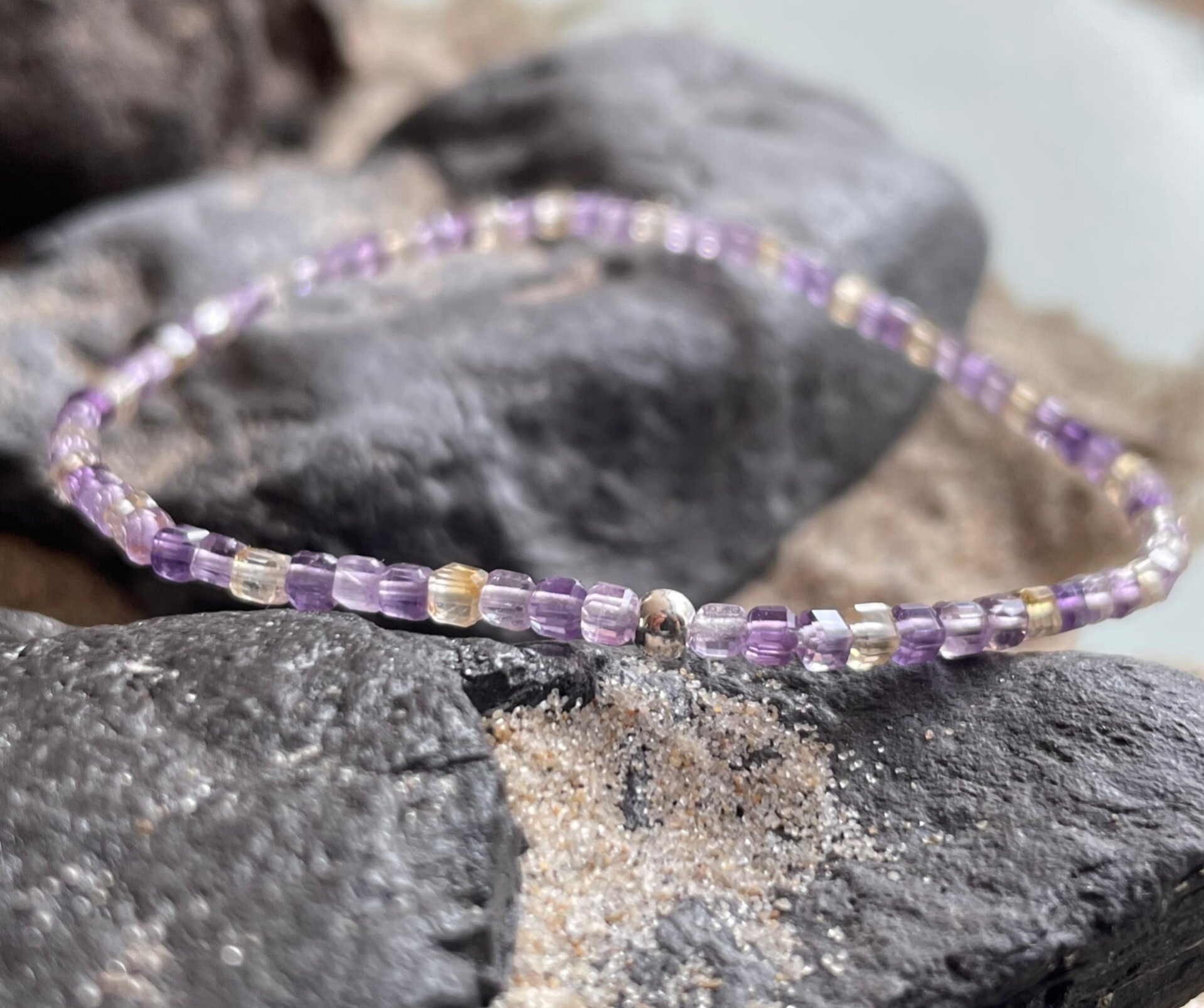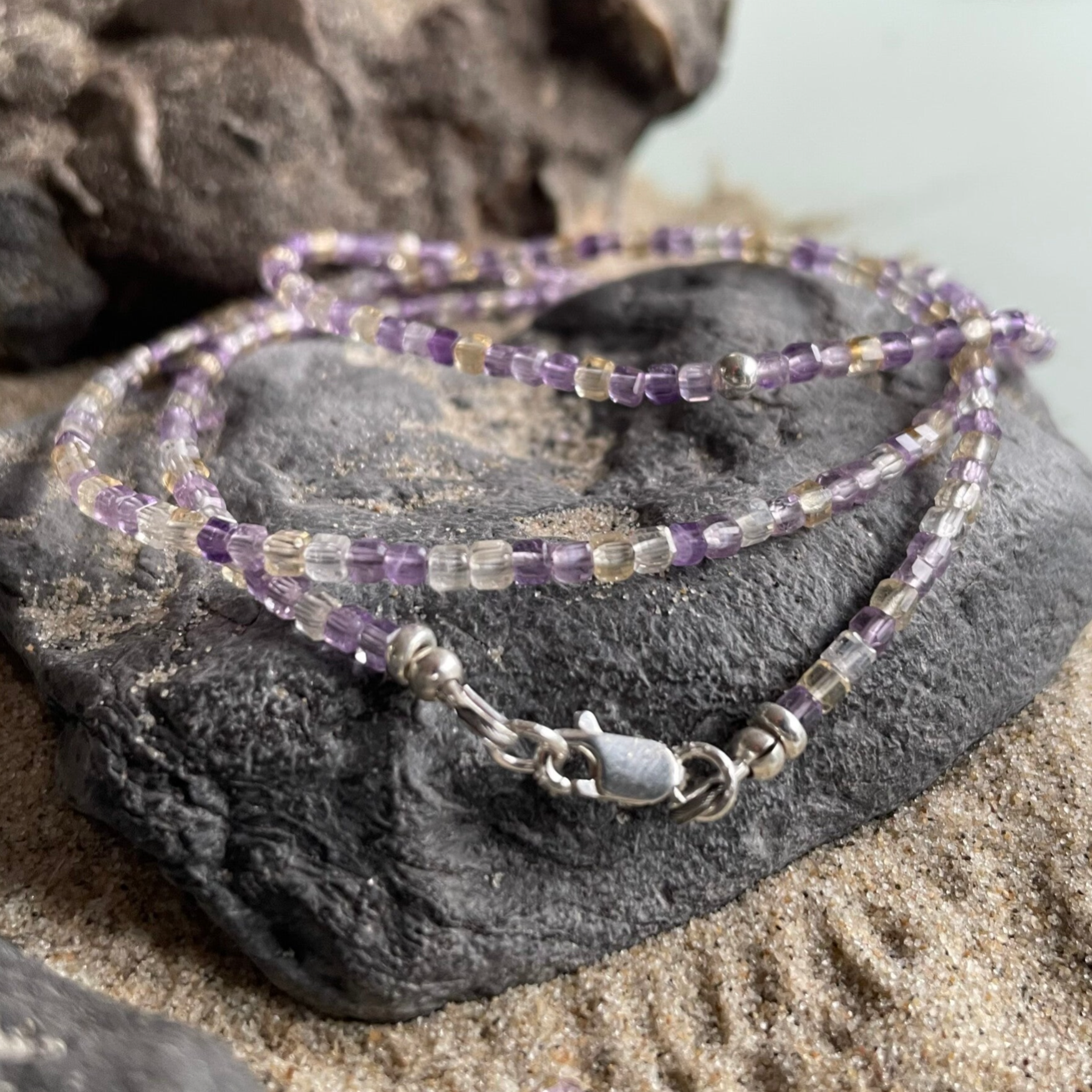 Der zarte Ametrin Edelstein Choker BLÜTENKRANZ verzaubert mit einem faszinierenden Farbspiel aus sanften Violett- und warmen Goldnuancen. Die kleinen, etwa 2 - 2,5 mm großen, quadratischen Edelsteinwürfel zeigen die typische Zweifarbigkeit des Ametrins – ein feines Zusammenspiel aus Amethyst und Citrin, das von zartem Flieder bis hin zu lichtdurchfluteten, sonnigen Gelbtönen reicht.
