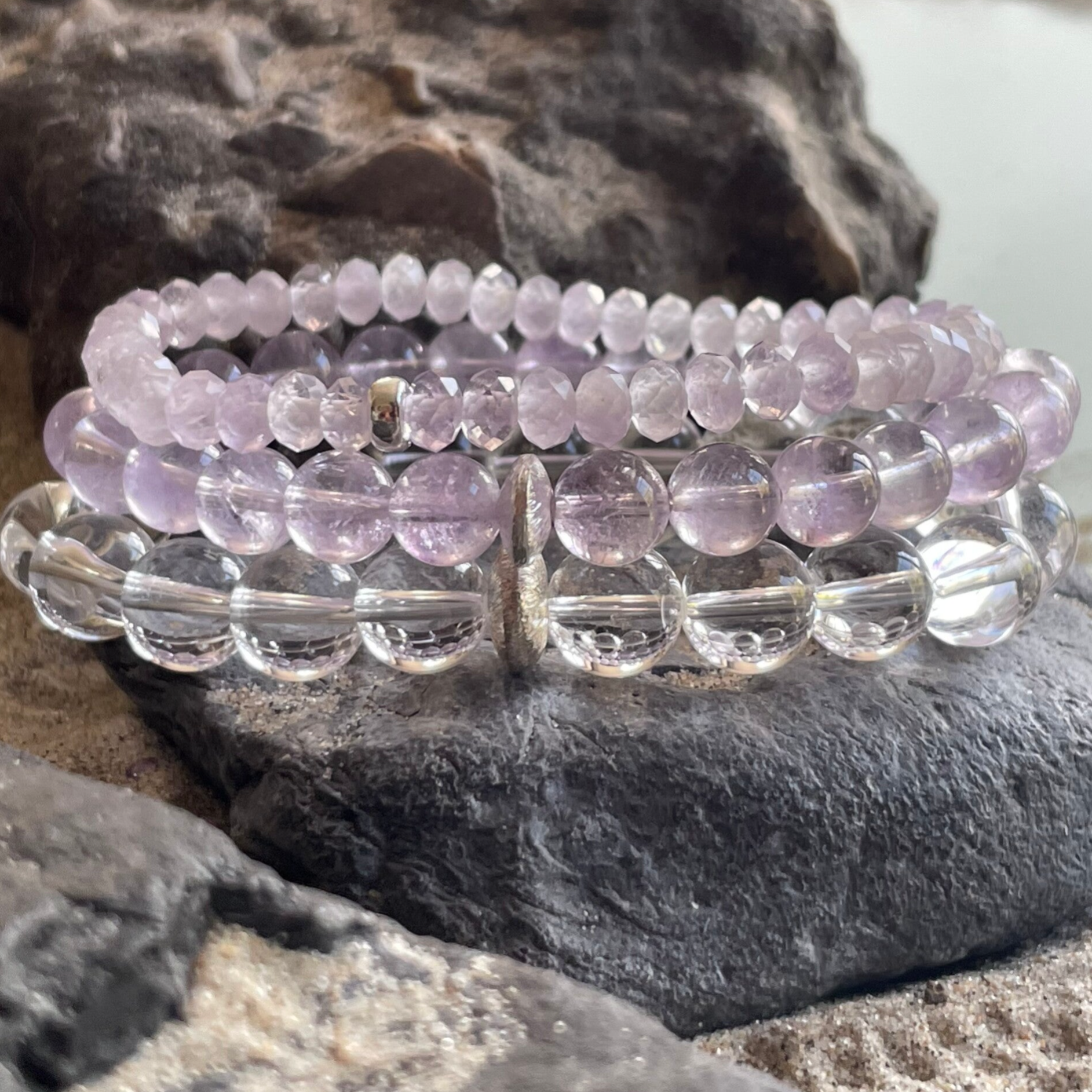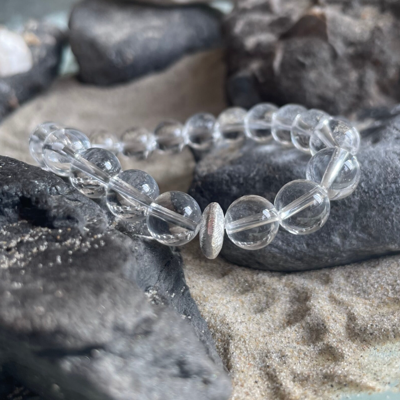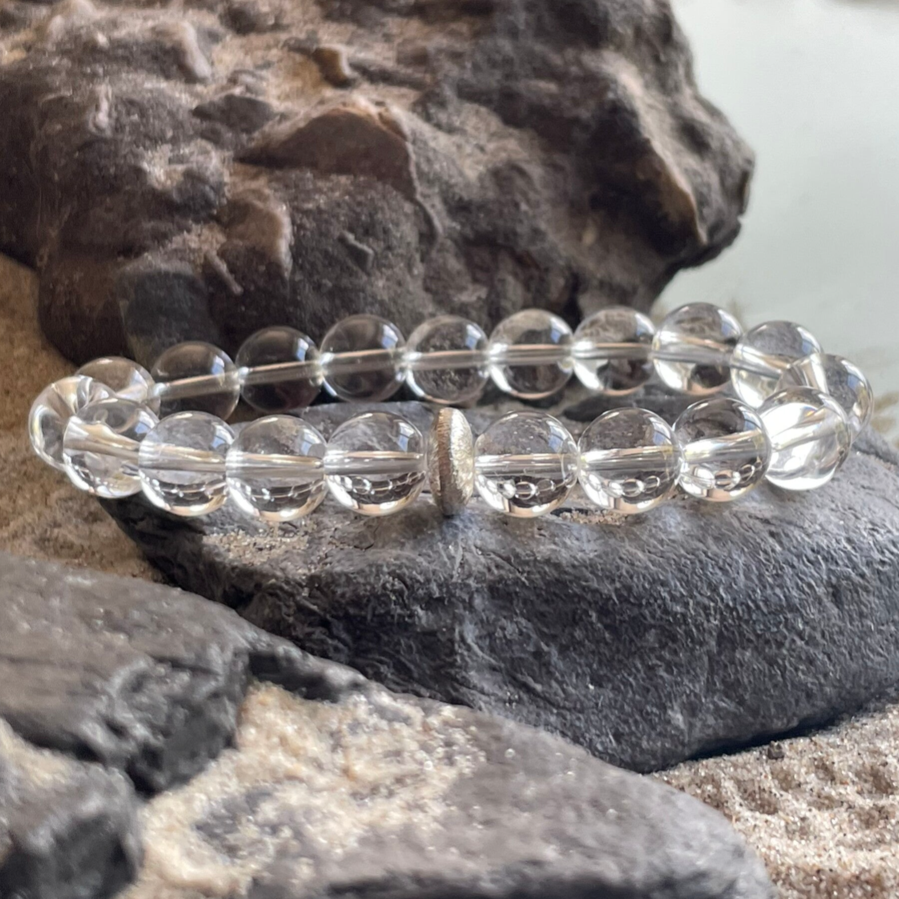 Ein fein strukturiertes 925 Sterling Silber Rondell fügt sich stilvoll zwischen die Bergkristalle und setzt zugleich einen dezenten, eleganten Akzent. Dieses Armband ist ein außergewöhnliches Schmuckstück, das durch die Größe und Reinheit der Bergkristalle besticht – schlicht, klar und dennoch ein echter Hingucker.