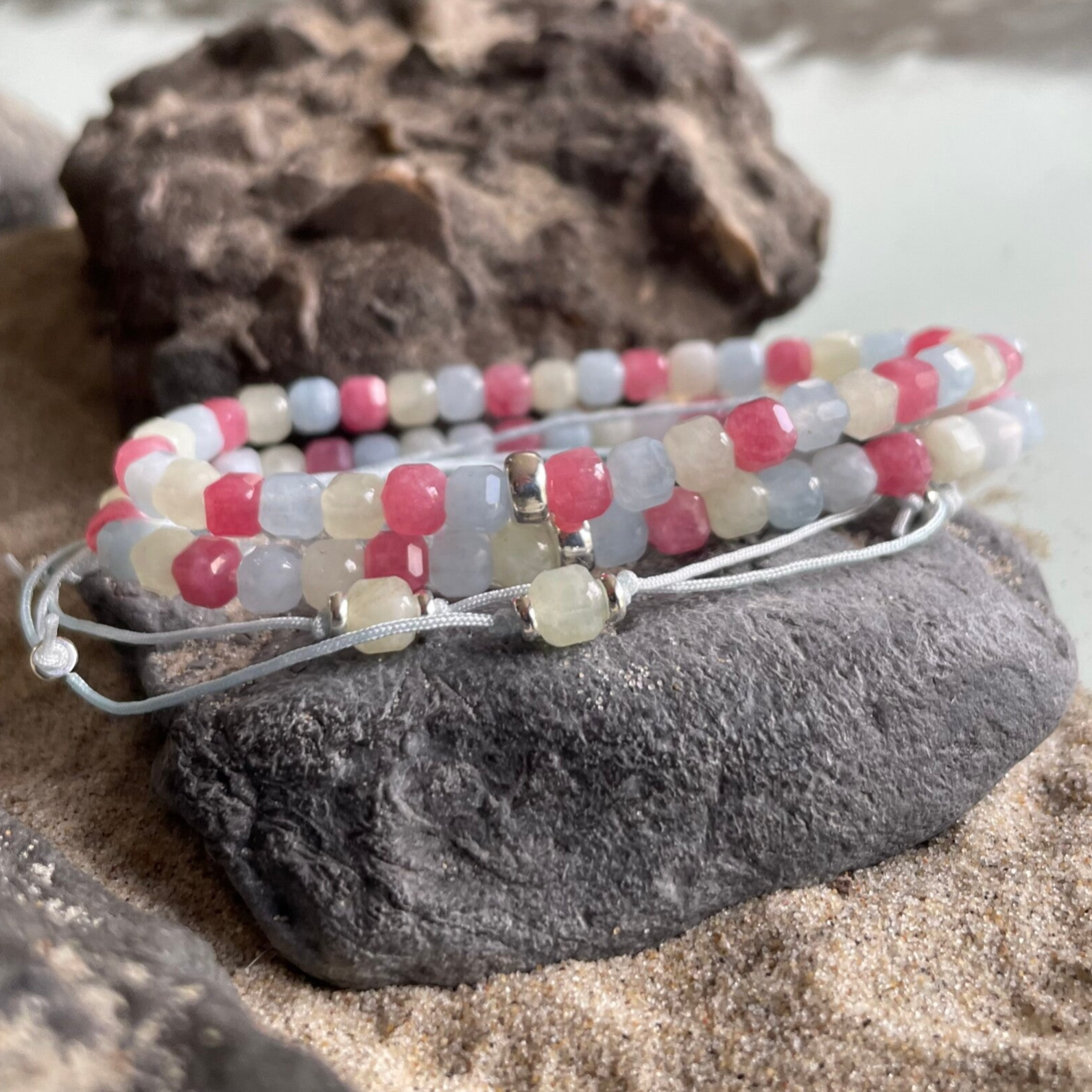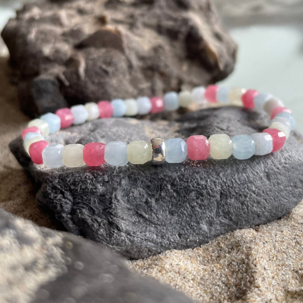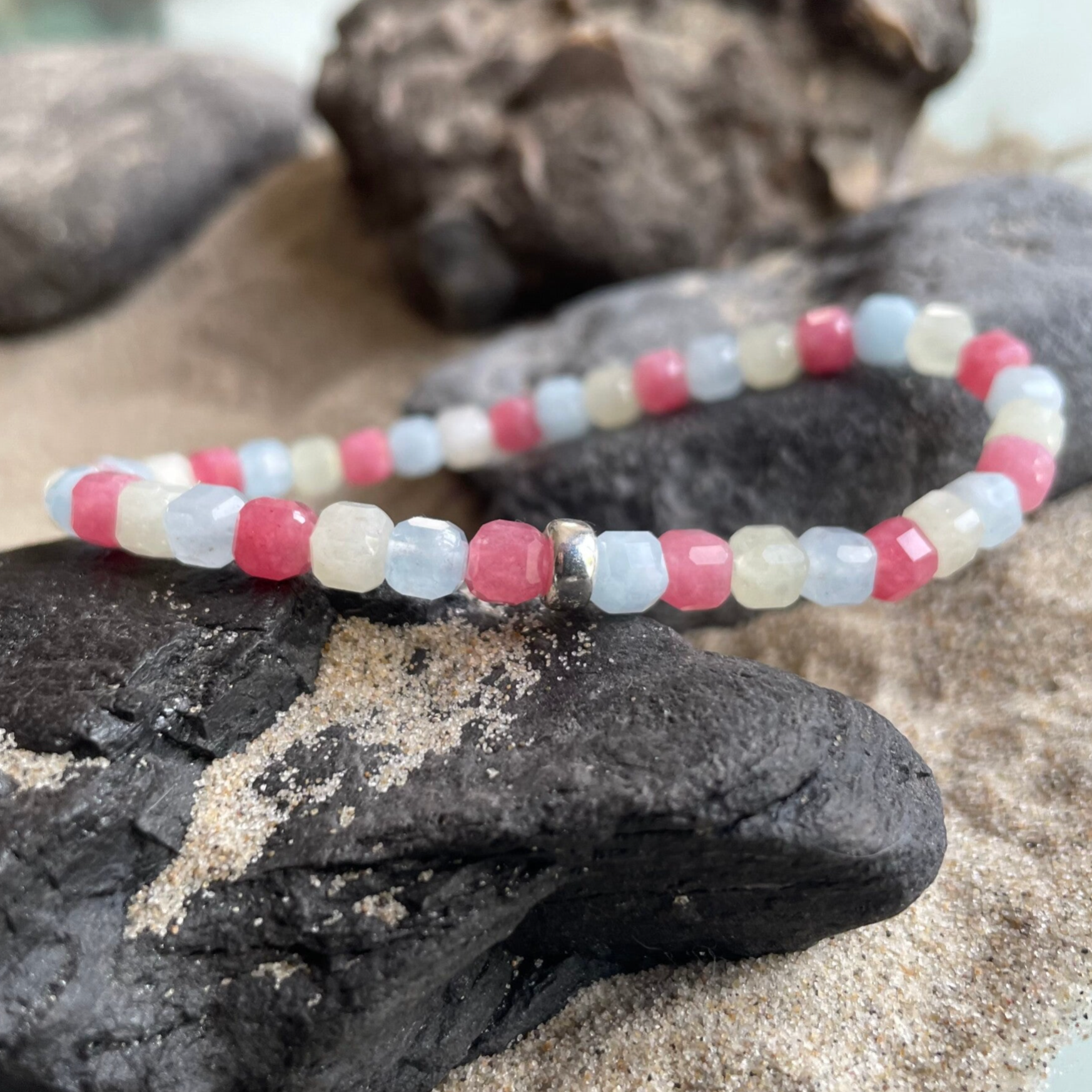 Dieses feine Morganit Edelstein Armband verzaubert mit einer lebhaften, sommerlichen Farbigkeit: Die etwa 5,5 mm großen, quadratischen Edelsteinperlen zeigen ein charmantes Zusammenspiel aus zarten Rosé-, sanften Blau- und warmen Gelbnuancen – inspiriert vom Wandelröschen, dessen Blüten sich ebenso wandelbar zeigen.