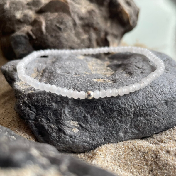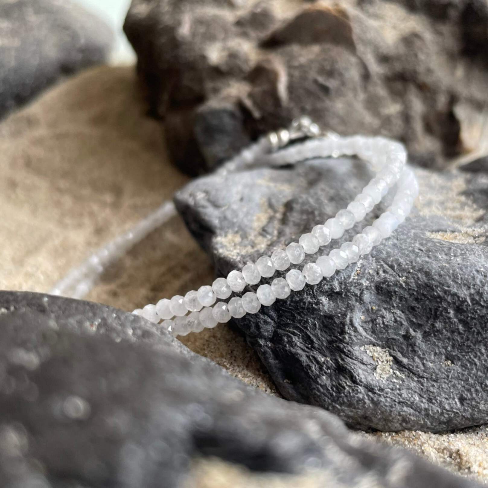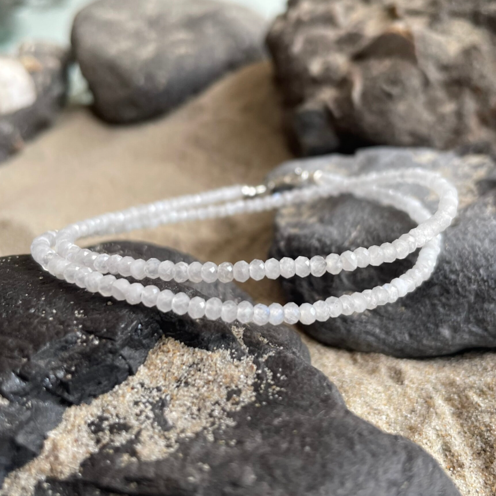 MONDKALENDER ist ein feiner Edelstein Choker aus ca. 3 mm großen, facettierten Regenbogen Mondstein Rondellen. Die Edelsteine zeigen sich in sanften Weißnuancen – oftmals blickdicht, teilweise leicht durchscheinend – und entfalten je nach Lichteinfall ein zartes, lebendiges Schimmern.
