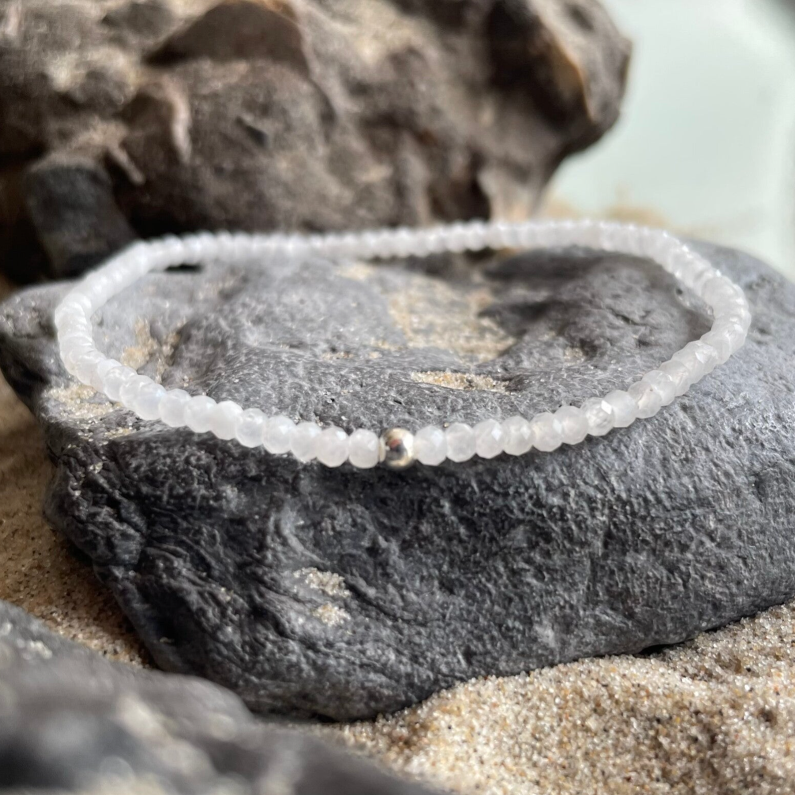 MONDKALENDER ist ein feines Edelstein Armband aus ca. 3 mm großen, facettierten Regenbogen Mondstein Rondellen. Die Edelsteine zeigen sich in sanften Weißnuancen – oftmals blickdicht, teilweise leicht durchscheinend – und entfalten je nach Lichteinfall ein zartes, lebendiges Schimmern.