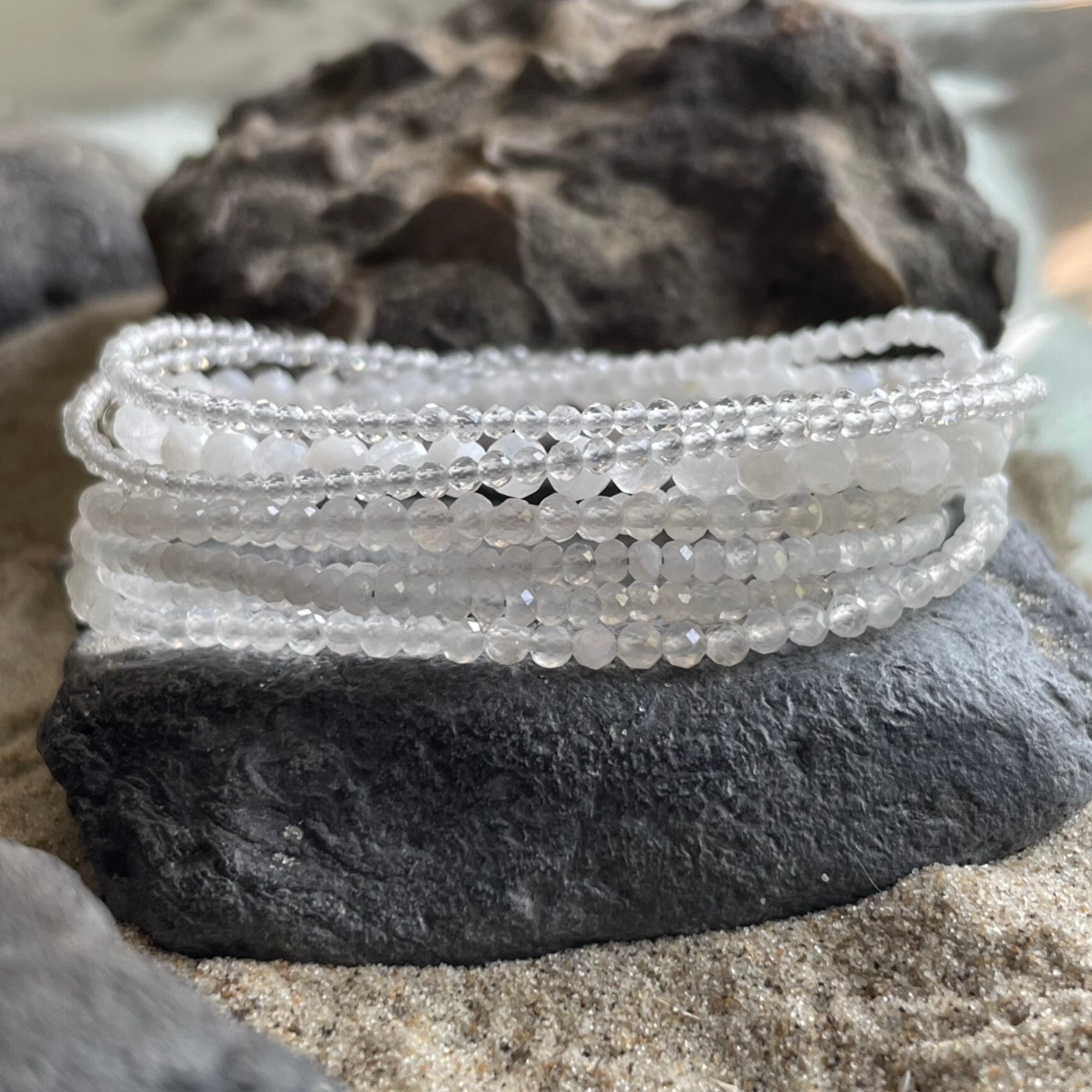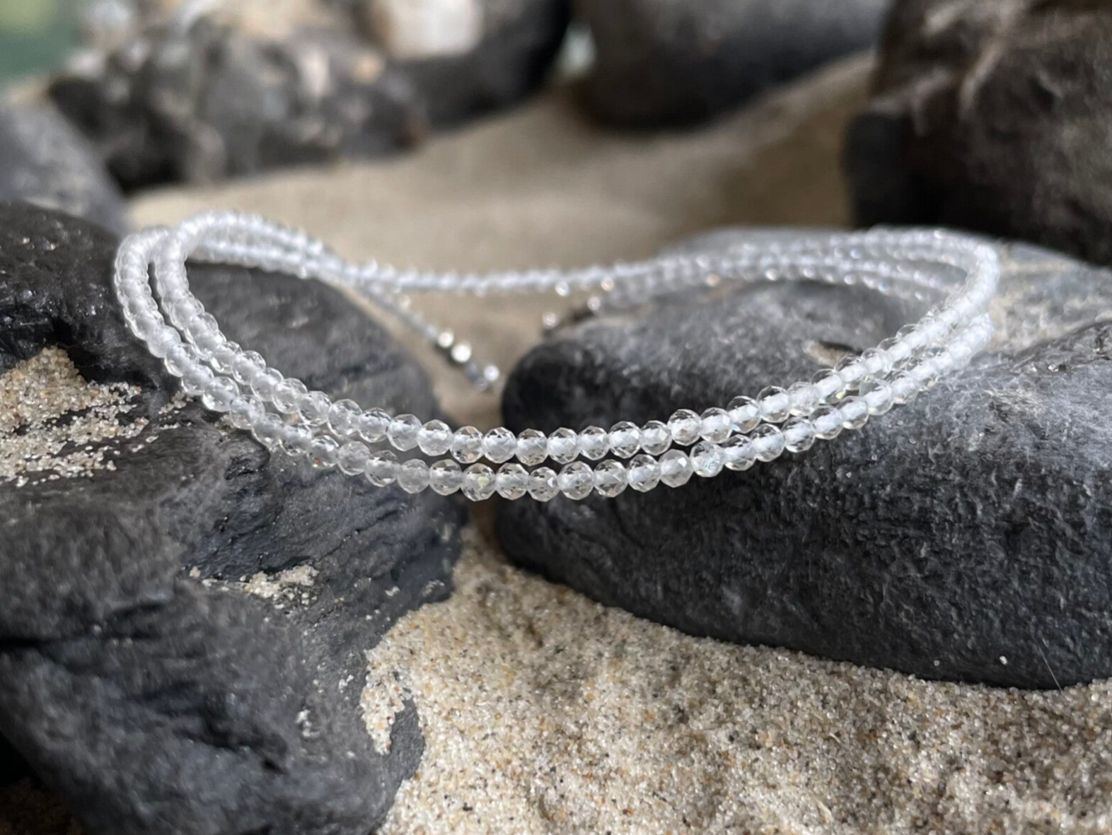 Bergkristall steht für Reinheit und Klarheit und fasziniert durch seine hohe Transparenz. Das Licht durchflutet die feinen Perlen und wird durch die facettierten Flächen sanft reflektiert – so entsteht ein zartes, lebendiges Funkeln, das dennoch ruhig und unaufdringlich wirkt.
