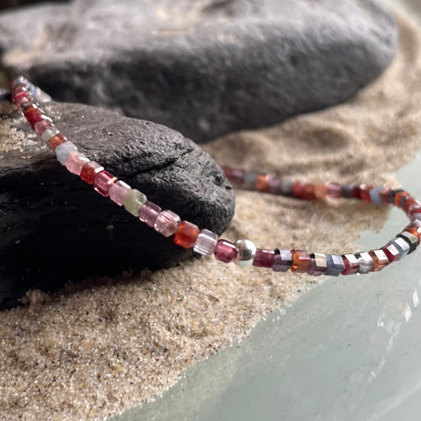 BEGEGNUNG ist ein feines Edelstein Armband aus ca. 2,5 mm großen, quadratischen Spinellperlen im eleganten Tafelschliff. Die facettierten Edelsteine verzaubern mit einer außergewöhnlich harmonischen Farbpalette aus Bordeaux-, Rot-, Aubergine- und zarten Lilanuancen, die sanft ineinander übergehen und dem Schmuckstück eine besonders schmeichelhafte Ausstrahlung verleihen.