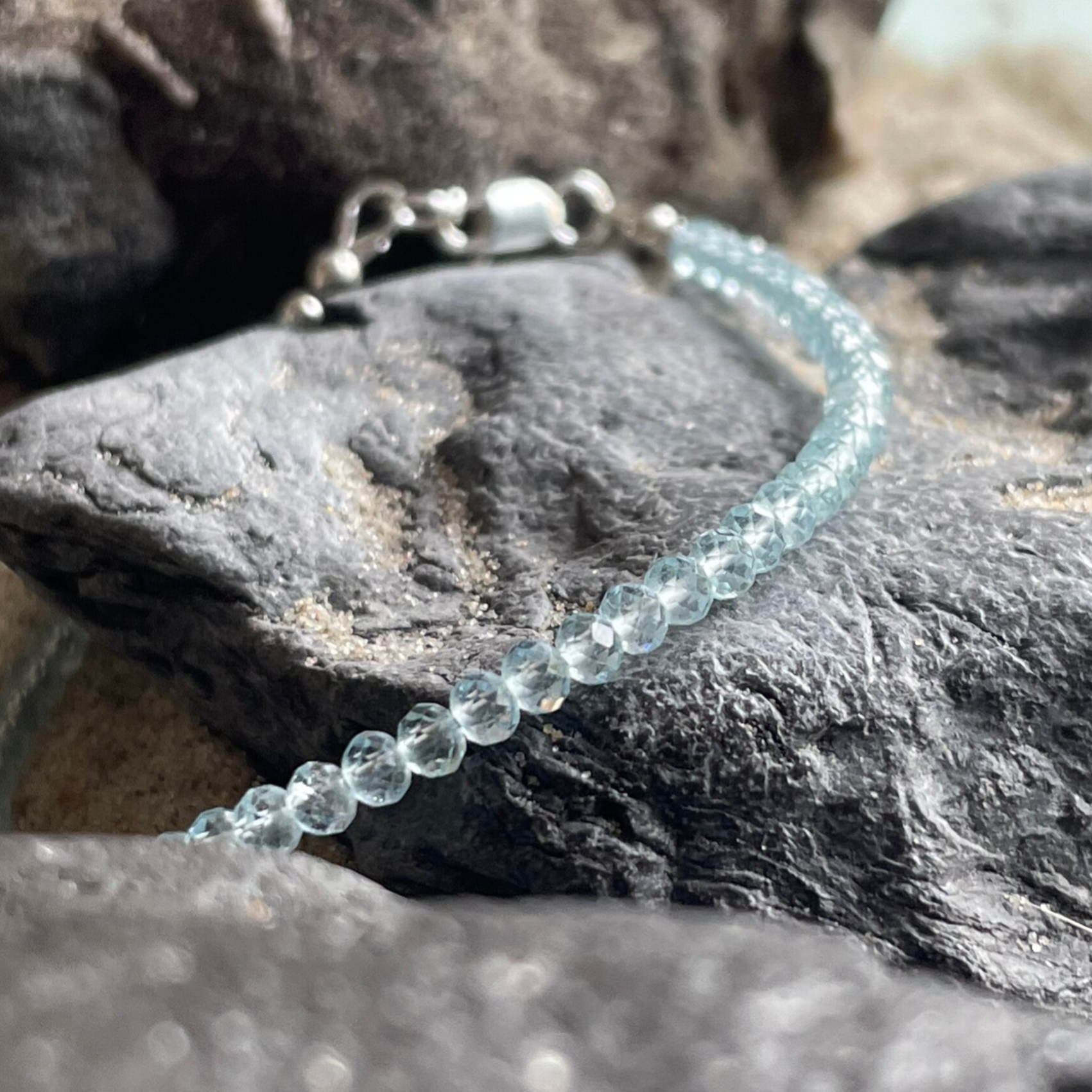 HIMMELSPOESIE ist das fein abgestimmte Gegenstück zu HIMMELHOCHJAUCHZEND – ein exklusives Edelstein Armband aus ca. 3 mm zarten Aquamarinrondellen im funkelnden Facettenschliff.