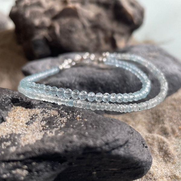 Die feinen Edelsteine zeigen sich durchgehend in einer sanften, hellblauen Nuance und begeistern mit einer beeindruckenden Transparenz. Das Licht durchflutet die klaren Rondelle und wird von den präzise geschliffenen Facetten lebendig reflektiert – ein Funkeln, das leicht und zugleich außergewöhnlich brillant wirkt.