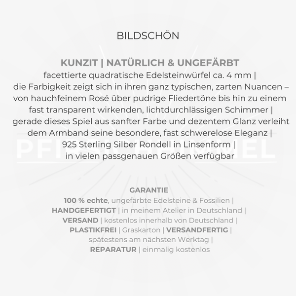 Die Farbigkeit des Kunzits zeigt sich in ihren ganz typischen, zarten Nuancen – von hauchfeinem Rosé über pudrige Fliedertöne bis hin zu einem fast transparent wirkenden, lichtdurchlässigen Schimmer. Gerade dieses Spiel aus sanfter Farbe und dezentem Glanz verleiht dem Armband seine besondere, fast schwerelose Eleganz.