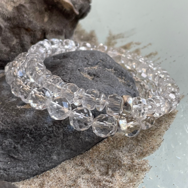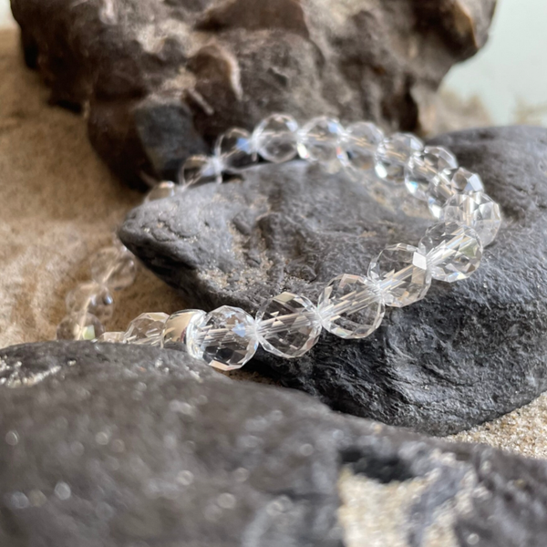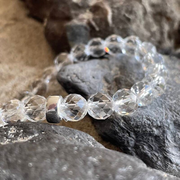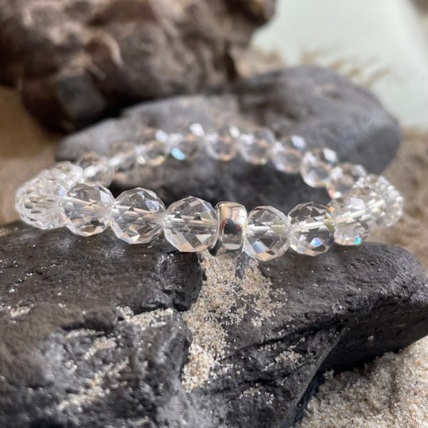 Die 8 mm facettierten Bergkristallperlen verzaubern mit einer nahezu schwerelosen Transparenz und einer faszinierenden Brillanz. Jede einzelne Facette fängt das Licht ein und bricht es in ein edles, lebendiges Funkeln – klar, rein und von einer ganz eigenen Strahlkraft.