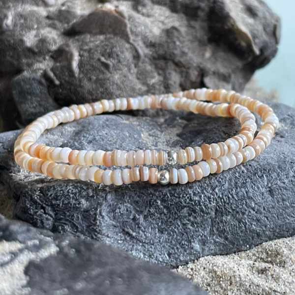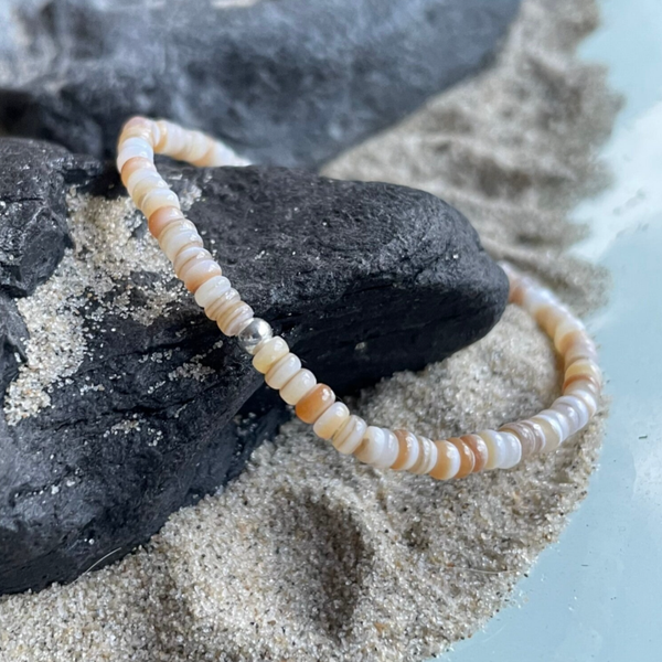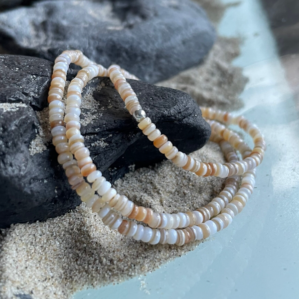 Die feinen Heishi-Rondelle aus Naturmuscheln zeigen sich in sanften Nuancen von hellem Sandbeige bis hin zu zarten Hellbrauntönen. Eine Farbigkeit, die sofort an Sand und Dünen erinnert.