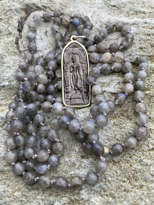 Der ungefärbte Labradorit verzaubert mit seiner natürlichen Schönheit und umschmeichelt mit vielen Lichtreflexen. Der handgearbeitete buddhistische Anhänger steht bewusst, mit seiner Unvollkommenheit, im interessanten Kontrast mit den feinen, filigranen Edelsteinen.