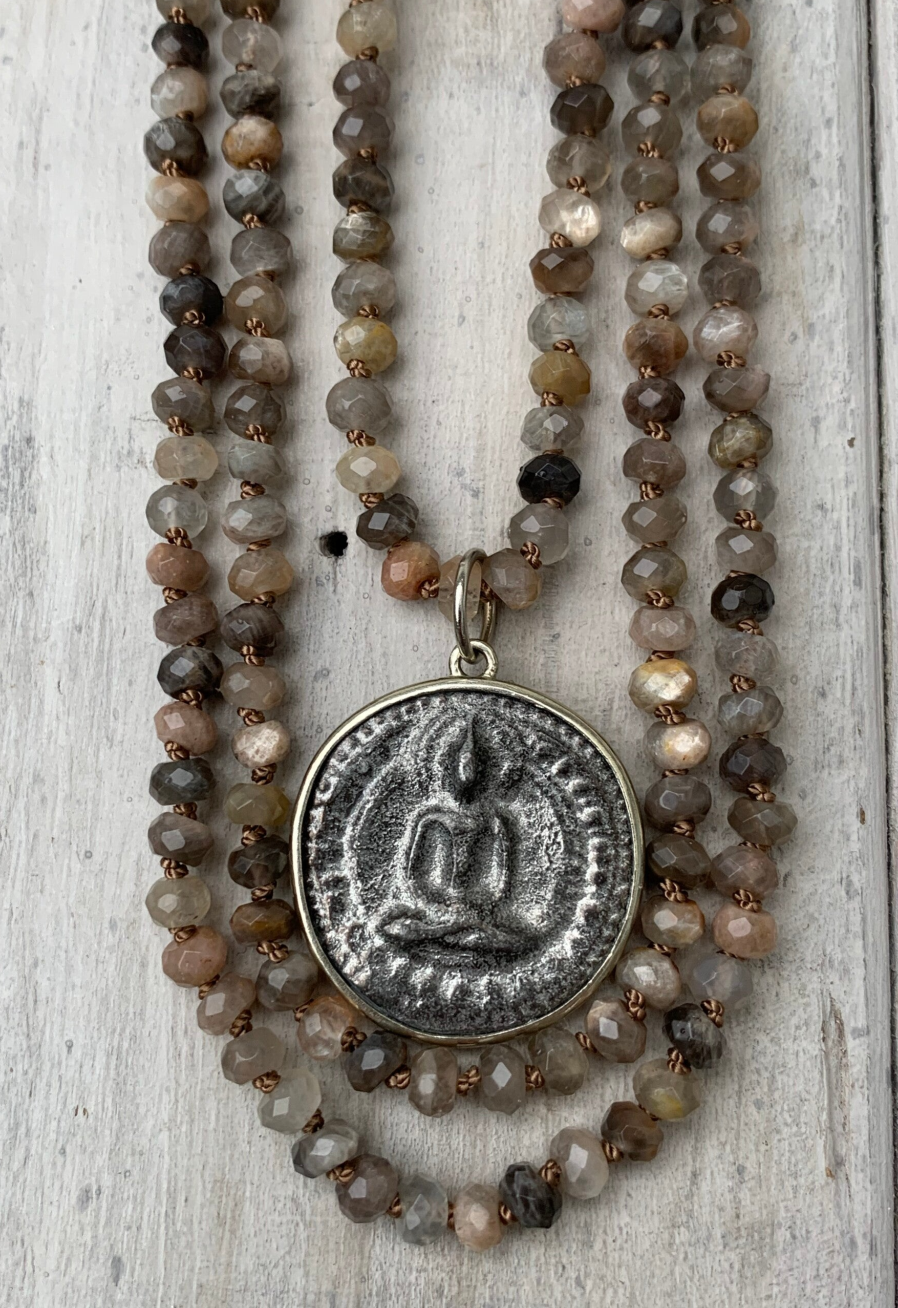 Die ungefärbten Edelsteine verzaubern mit ihrer natürlichen Schönheit und schmeicheln mit einem Hauch von Luxus bei zurückhaltender Eleganz. Der handgearbeitete buddhistische Anhänger steht bewusst, mit seiner Unvollkommenheit, im interessanten Kontrast mit den feinen, filigranen Edelsteinen.