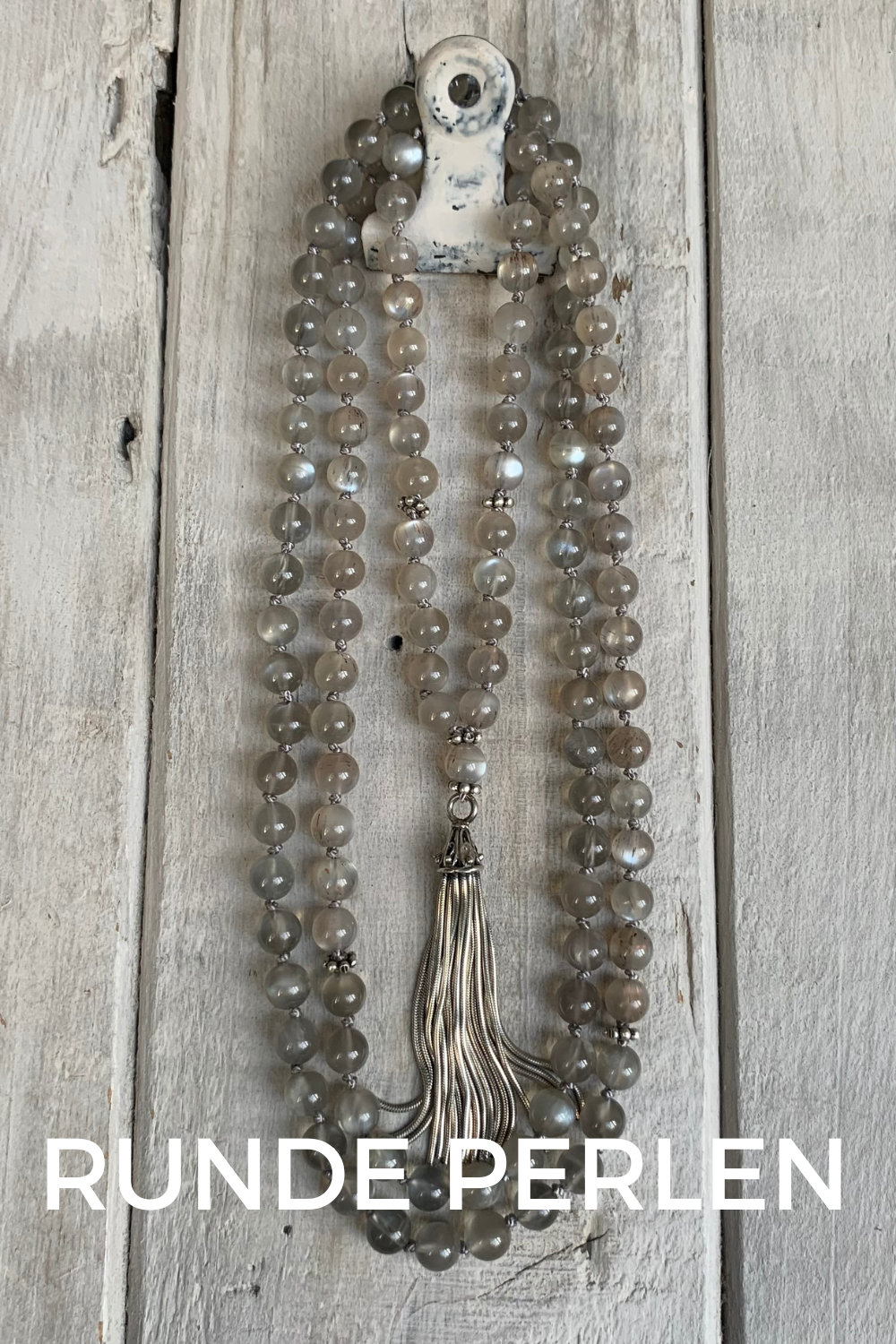 Wir prüfen jede Perle vor der Knüpfung und achten darauf, dass sich keine Steine einschleichen, die komplett aus dem Gesamtbild fallen.